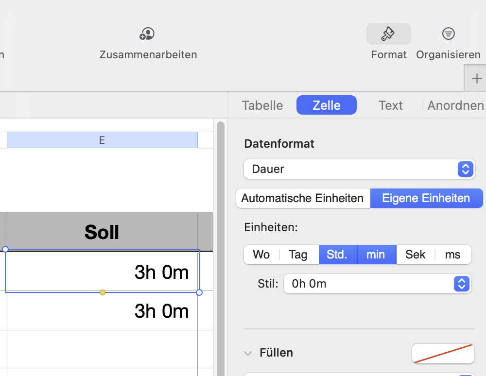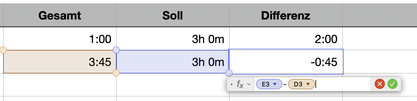 vielen Dank. Das ging jetzt, aber nur nachdem ich die Sollzeiten mit Dezimalwert eingegeben habe. Komisch. Ich habe also 4,25 eingegeben. Geschrieben steht da allerdings dann 4:15. (Was hat sich Apple bloß dabei gedacht?)