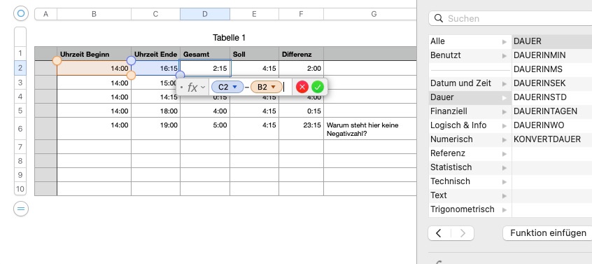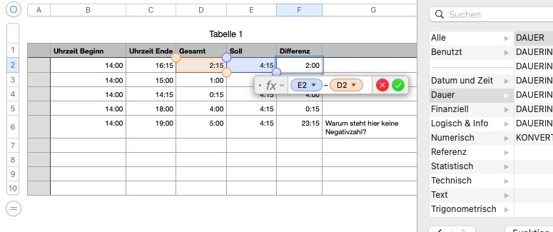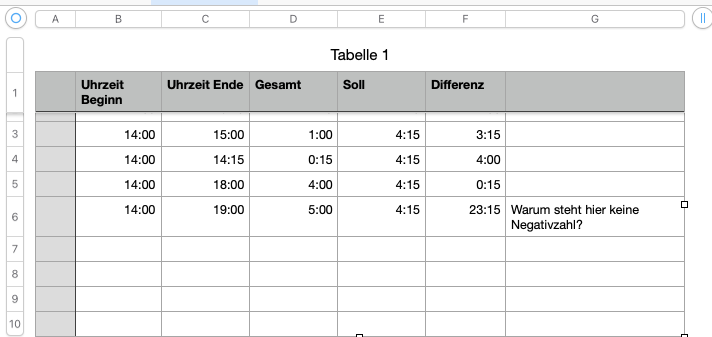 Ich möchte (für mich persönlich) meine Arbeitszeiten dokumentieren. Dazu habe ich eine Tabelle erstellt. Klappt solange ich Plusstunden mache auch, aber sobald ich Minusstunden habe rechnet Numbers das nicht korrekt.