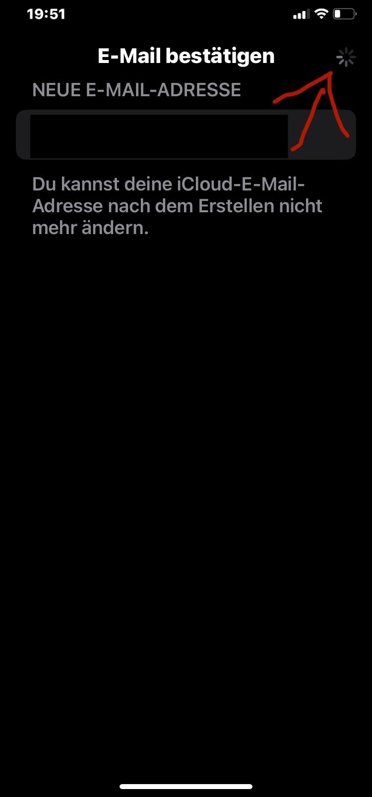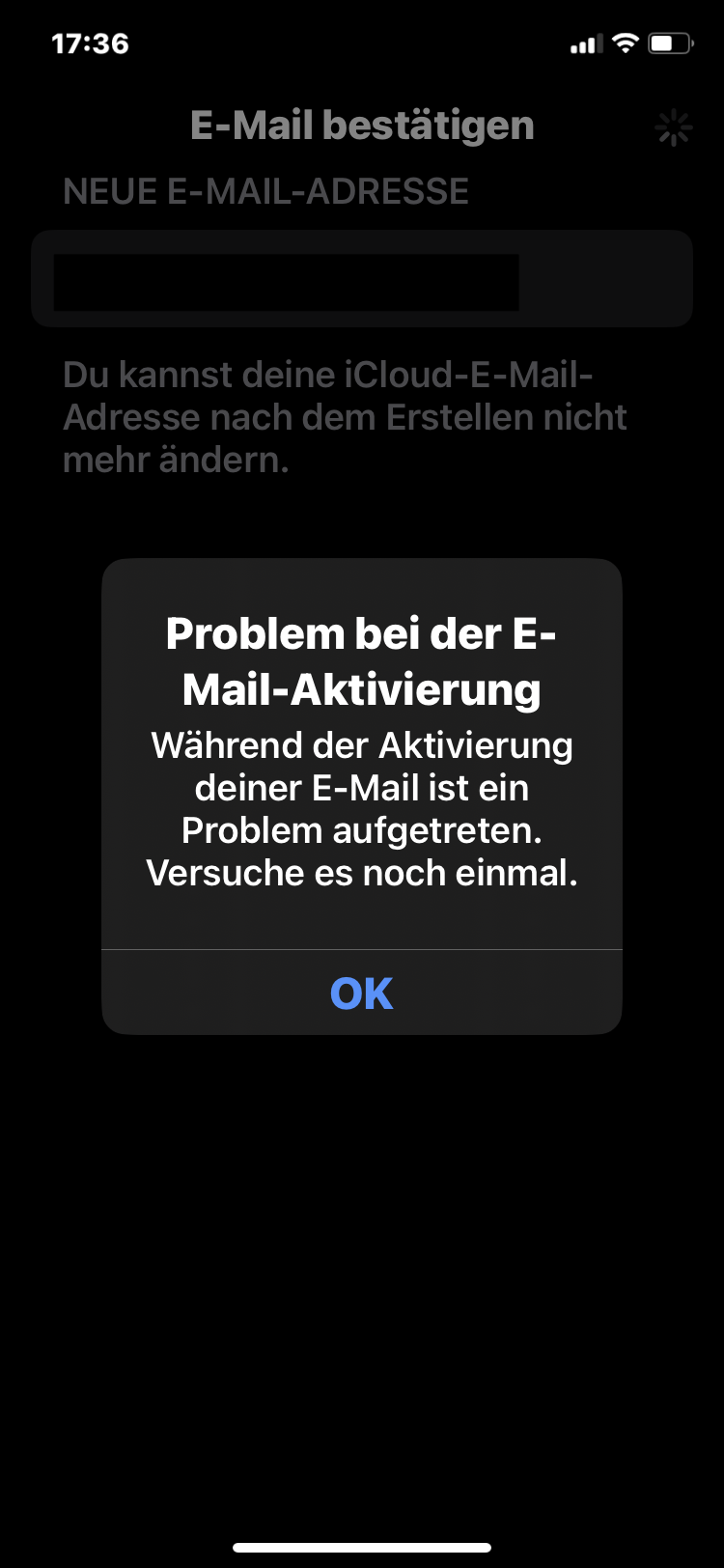 Im iPhone bin ich folgendermaßen vorgegangen. Unter Einstellungen>Apple ID>iCloud>iCloud-Mail habe ich versucht „Auf diesem iPhone“ zu aktivieren. Ich werde dann aufgefordert eine kostenlose E-Mail-Adresse mit „@icloud.com“ zu erstellen. Ich gebe im nächsten Schritt die email-Adresse ein, die ich gerne hätte und gehe dann auf weiter. Dann bekomme ich die Meldung „Ein Problem ist aufgetreten.“ Ich bestätige mit ok und dann dreht sich das Rädchen oben rechts ständig und ich komme nicht weiter. Ich muss Einstellungen komplett schließen.