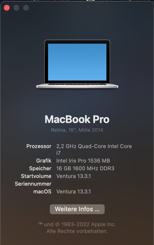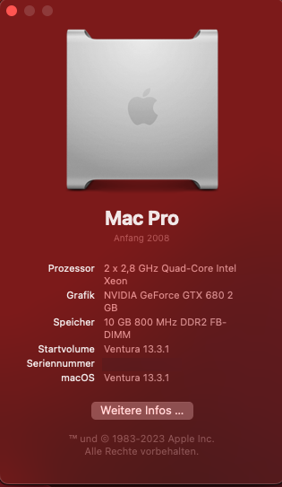 Es bliebe dir allerdings noch die Option, ein gepatchtes MacOS (bis hin zu macOS Ventura 13.3.1) zu installieren, ein MacOS also, das zwar seitens Apple als nicht mehr kompatibel mit dem Typ oder dem Modelljahr deines Mac deklariert wird, das aber von einem äußerst fachkundigen Entwicklerteam für diese "nicht-kompatiblen" Rechner lauffähig gestaltet wurde.