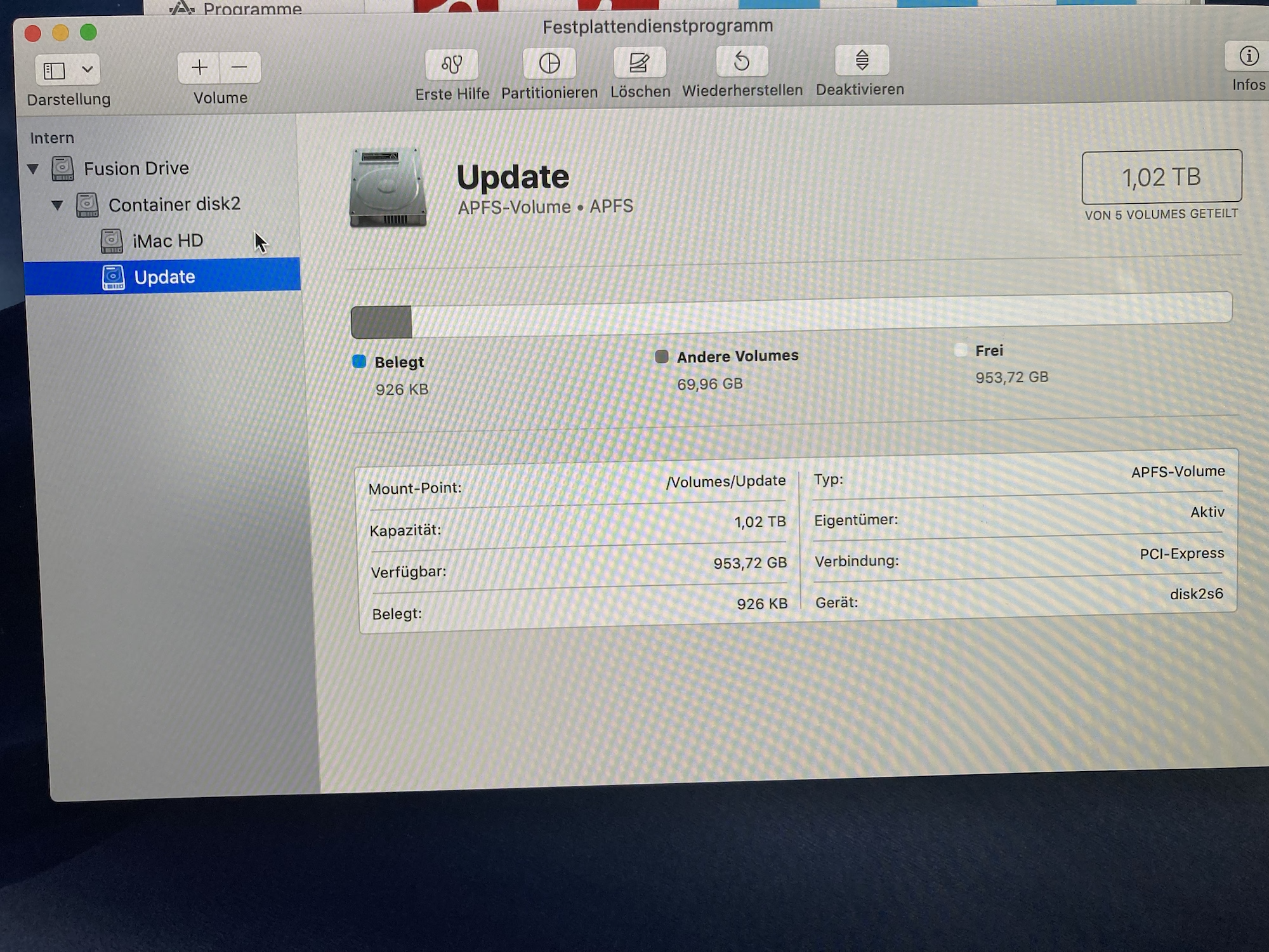 Hallo, meine Frau hat einen alten late 2015 (21,5) iMac erstanden. Komischerweise erscheinen 2 interne Festplatten. Beide gleiche Grösse (1 TB) als SSD - angezeigt im Systemprofiler und im Festplattendienstprogramm. Ich komme nicht dahinter woran das liegen kann. Ich kann mir nicht vorstellen, dass 2 SSD im iMac verbaut worden sind. Ich habe echt Zweifel ob es sich um 2 physikalische HD handelt. Ich glaube eher, dass was nicht in Ordnung ist. Bin seit fast 40 Jahren Mac Nutzer, aber komme nicht weiter. Der Verkäufer konnte auch nicht helfen. Hat jemand eine Idee?