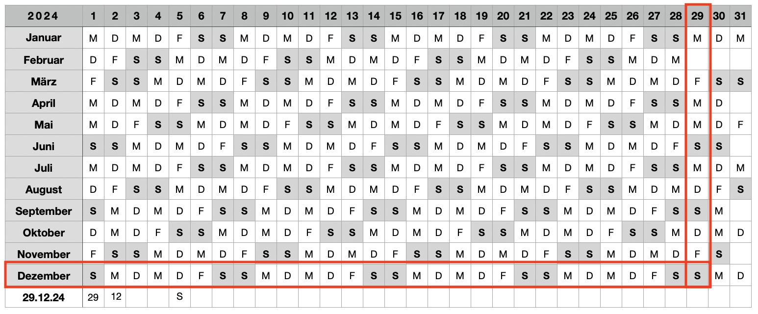 Im Ergebnis wird das Wochentagsfeld hervorgehoben, das den aktuellen Tag abbildet.