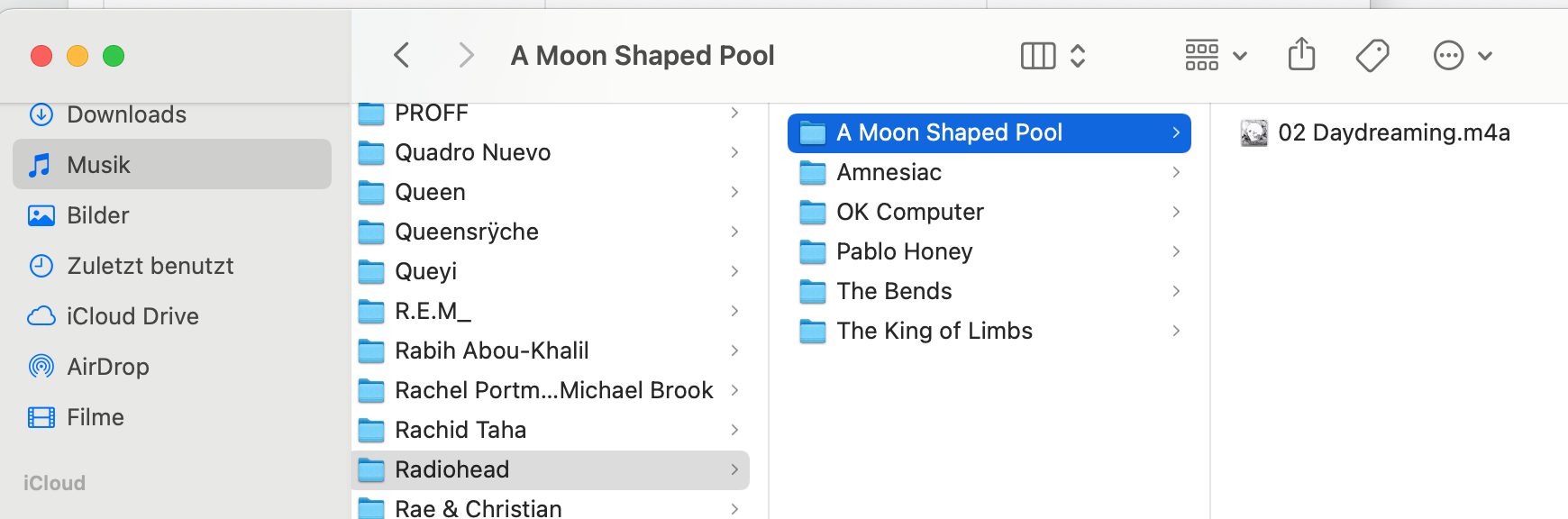 Aber: Wenn ich Musik im Finder anzeigen lasse, wird mir häufig nur ein Musik-Symbol statt des Covers angezeigt, manchmal aber das korrekte Cover. Woran liegt das denn? Siehe Bsp. Screen Radiohead: Alle Songs wurden am iPhone im iTunes Store gekauft, bei Codex und Creep sieht man nur das Symbol, bei Daydreaming das korrekte Cover! Und wie kann ich da eingreifen?