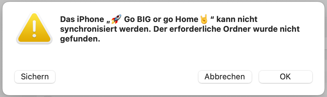 ich habe auf einem Order auf unserer NAS mehrere Unterordner für unterschiedliche Fotoalben angelegt und möchte diese über Finder mit meinem iPhone synchronisieren. Mac und iPhone ist auf dem aktuellen Stand, NAS ist verbunden und ich kann den Order und die Subordner auswählen. Sobald ich auf "Anwenden" bzw. "Syncen" klicke werden 4 der 5 Synchronisierungsschritte durchgeführt und beim Schritt 5 Synchronisieren, erhalte ich folgende Fehlermeldung und in der Leiste unten im Finder steht "Synchronisieren (Schritt 5 von 5) - Auf das Anwenden der Änderungen warten.