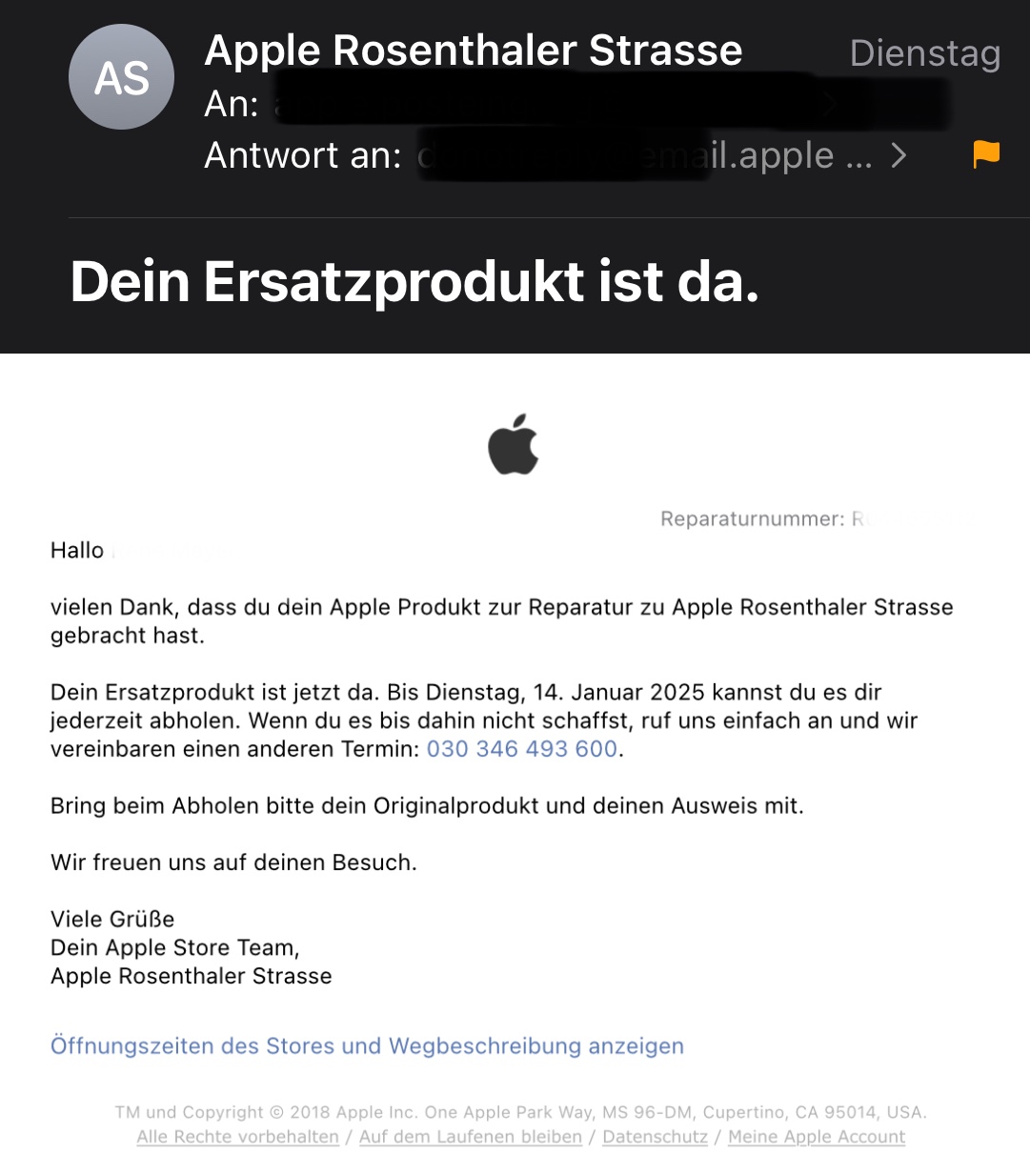 Die Mail hat den Betreff “Ihre Apple Rechnungsnummer…“, leider stimmt die Rechnungsnummer nicht mit der Bestellnummer überein, daher war es für mich zunächst nicht sofort ersichtlich, dass dies die „gesuchte Mail“ ist.