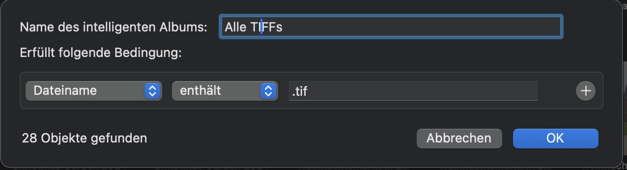• Gehe zurück auf deine aktuelle Mediathek und lege ein intelligentes Album an, um systematisch in kleinen Gruppen Videos und Fotos anzuwählen. Beispielsweise, um alle TIFFs zu finden: