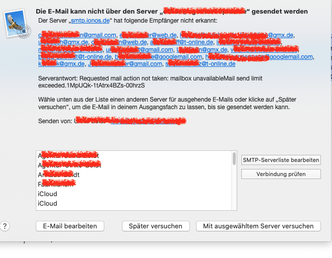Jetzt ist wieder 1,5 Tage später und wieder funktioniert die Mailadresse nicht. Ich kann keine Mails versenden und bekomme dieses Mal den Hinweis, dass die E-Mail über den SMTP-Server nicht gesendet werden kann. Wenn ich die SMTP Verbindung überprüfe, ist die Verbindung und Anmeldung beim Server erfolgreich. Trotzdem geht die Mail nicht raus. Das Empfangen funktioniert.