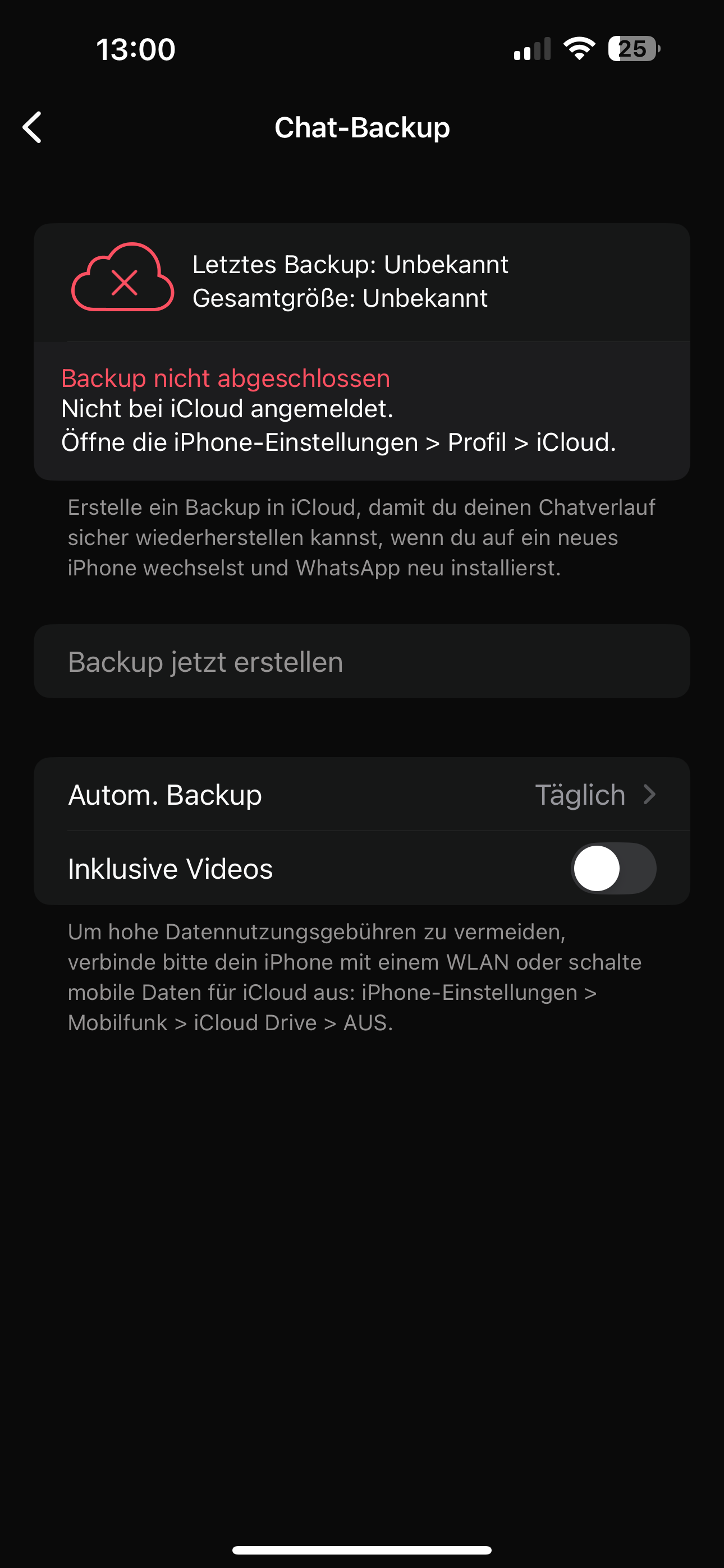 Ich bin neu dabei, die iCloud treibt mich in den Wahnsinn (musste erst mangels Speicherplatz auf 50, dann auf 200 GB upgraden, nur um festzustellen dass das iPhone Backup - wie erwartet - 9 GB groß ist). Jetzt aber zu meinem Problem: WhatsApp. Ich habe wie erwähnt ein erfolgreiches allgemeines iCloud-Backup gemacht (WhatsApp auch ausgewählt) aber WhatsApp meint weiterhin (hab mein Handy mehrfach neu gestartet und mich auch immer wieder bei der iCloud ab und angemeldet), dass ich "nicht bei iCloud angemeldet" sei...