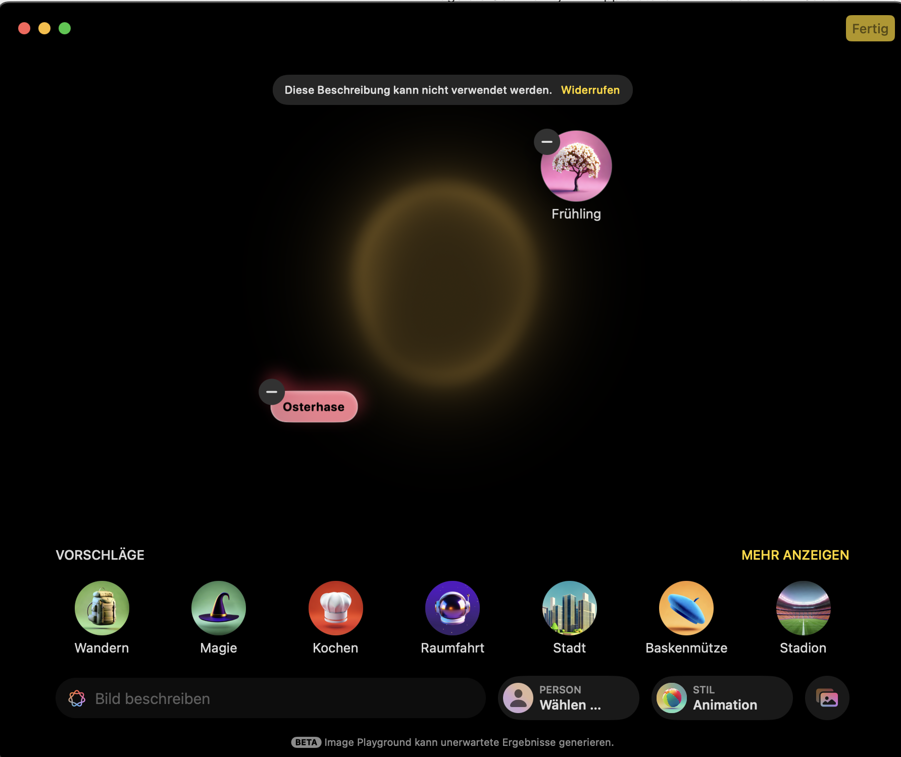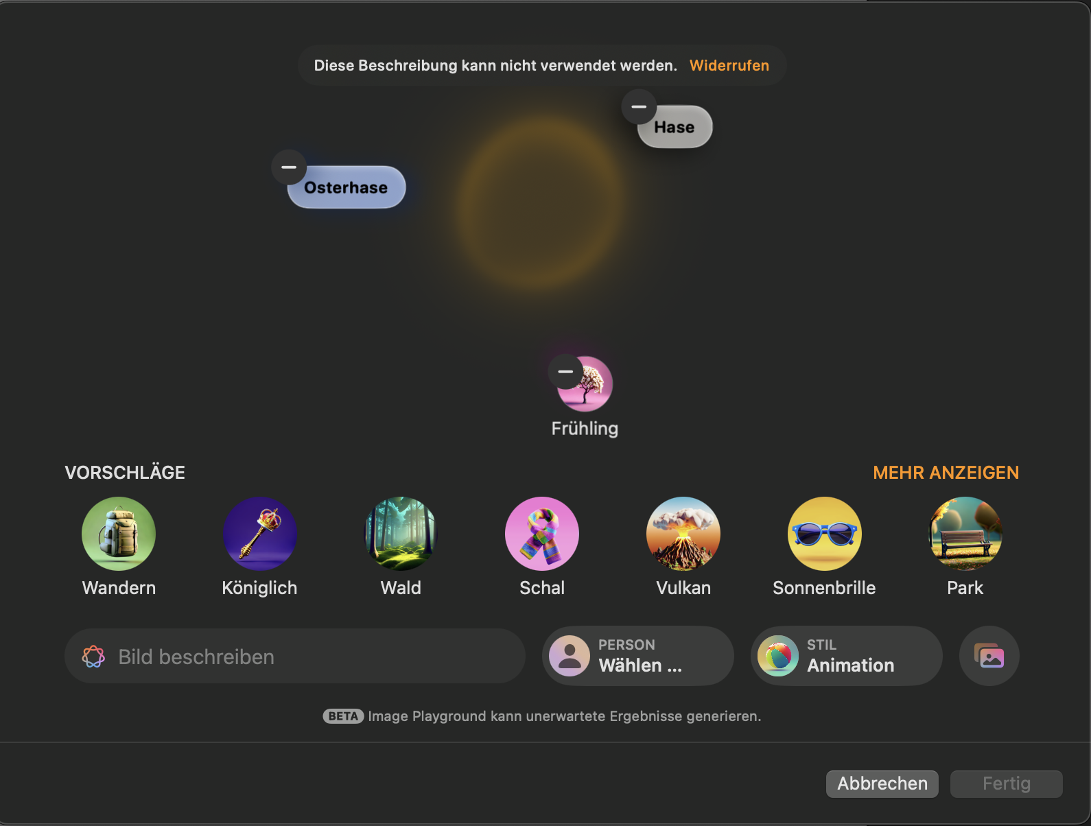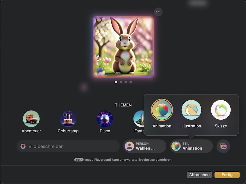 Ganz anders ist es, wenn ich Pages öffne und dort über das Menü "Medien" einen Image Playground einfüge. Dann kann ich ein neues Bild beschreiben. Hier hatte ich beispielsweise das Thema "Frühling" gewählt, dann als Beschreibung "Osterhase im Blumenbeet". Das Resultat passt.