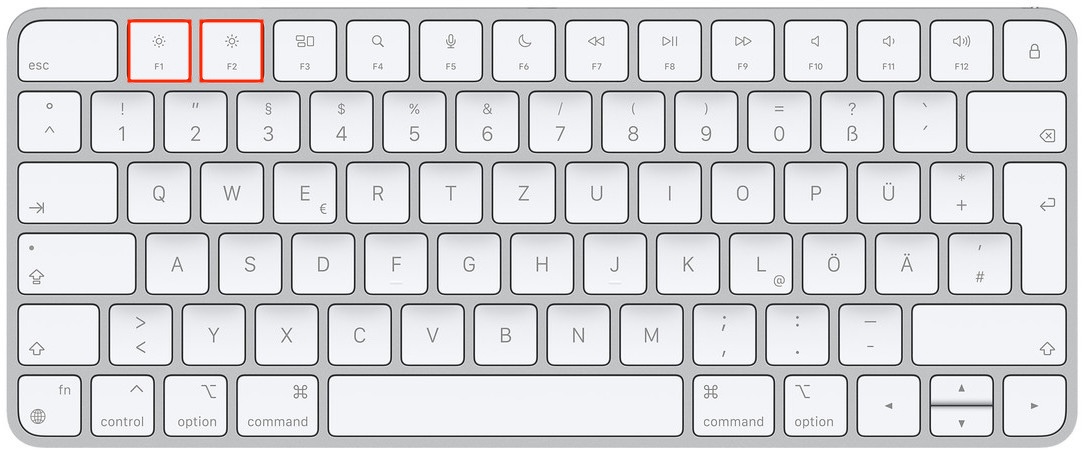 Die Helligkeit des Displays lässt sich selbstverständlich auch über die Tastatur deines Macs regeln. Nutze hierzu die Tasten "F1" für dunkler oder "F2" für heller. Ändern der Bildschirmhelligkeit deines Mac - Apple Support (DE)
