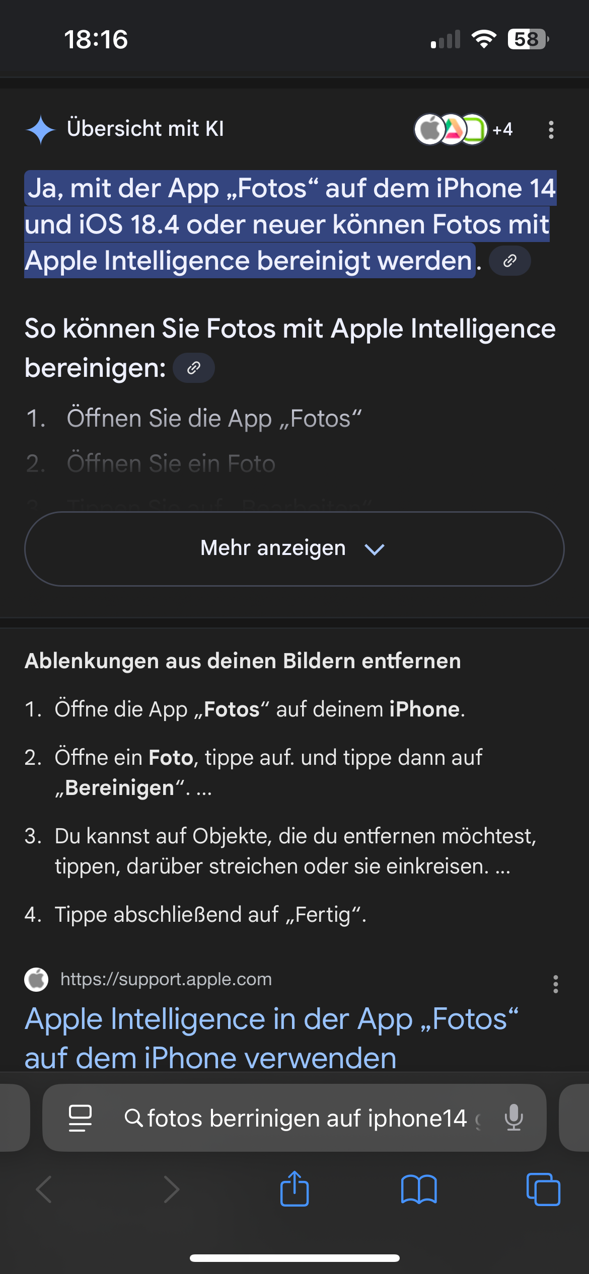Übrigens, hier der entsprechende Support Artikel von Apple, ich habe die Stelle Markiert wo kompatible Geräte aufgelistet sind, und ich würde mal behaupten der Artikel von Apple selber weiß es besser als Google Gemini ;) Voraussetzungen für die Verwendung von „Bereinigen“ in der Fotos-App - Apple Support (DE)