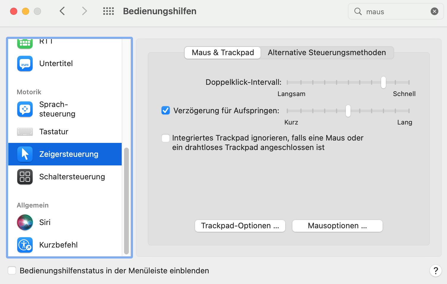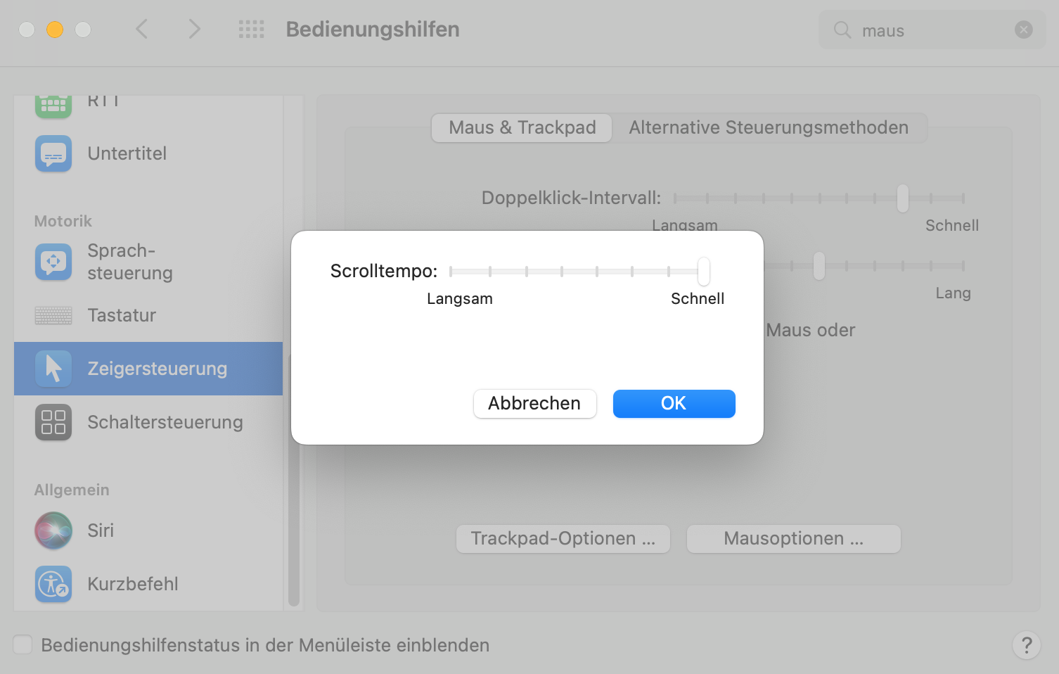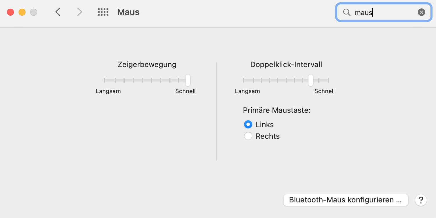 - Alle Einstellungen gesetzt; wobei mir aufgefallen ist dass mir offensichtlich die richtigen Einstellungsoptionen fehlen (siehe Screenshots von Einstellungen "Maus" und Einstellungen "Bedienungshilfen"). Ich kann das Scrollen zB nicht aktivieren/deaktivieren oder "natürliches Scrollen" zur Auswahl sehen, wie das in anderen Foren beschrieben wird