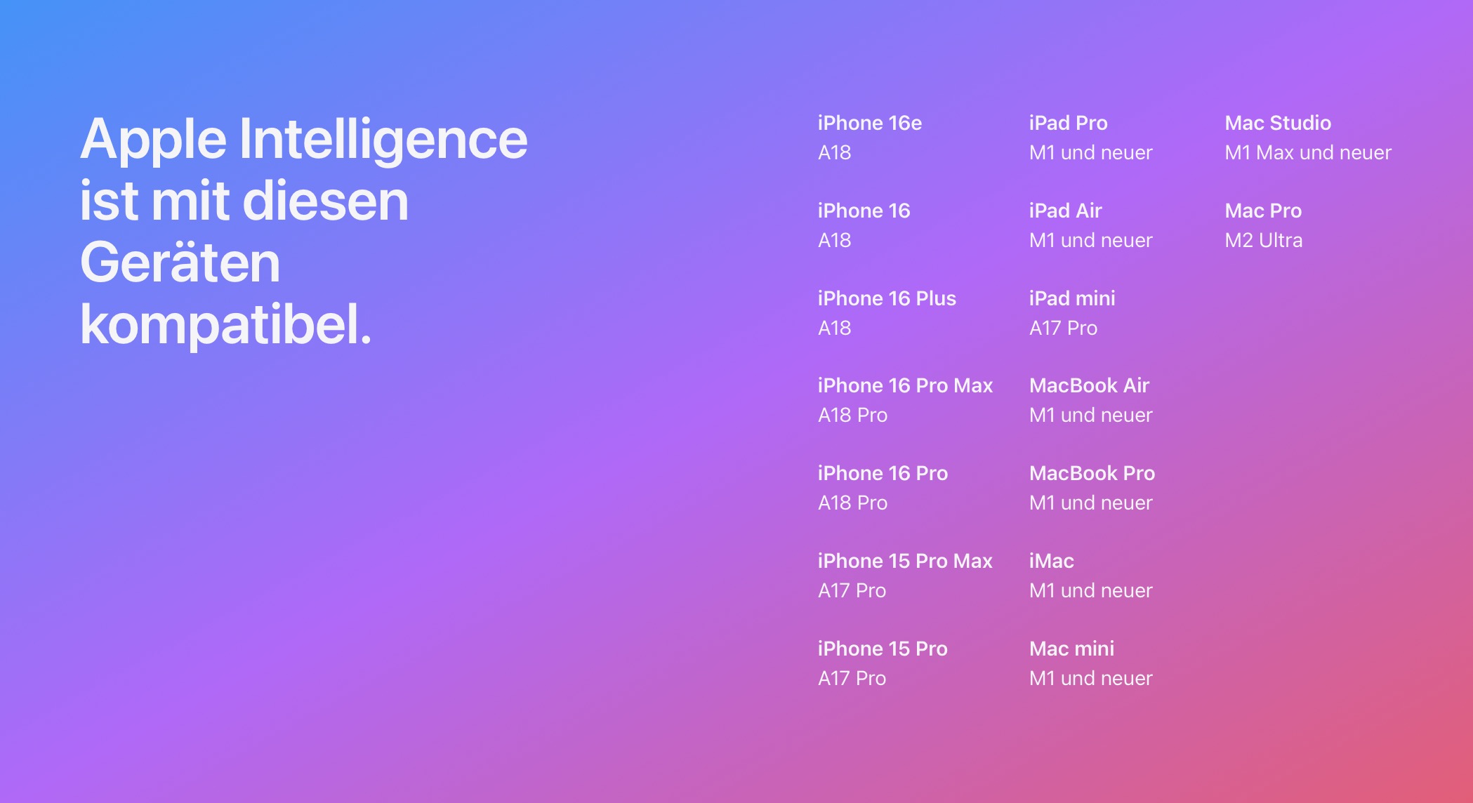 Apple beschreibt in den Anforderungen für die Hardware, welche Modelle unterstützt werden: Apple Intelligence - Apple (DE)
