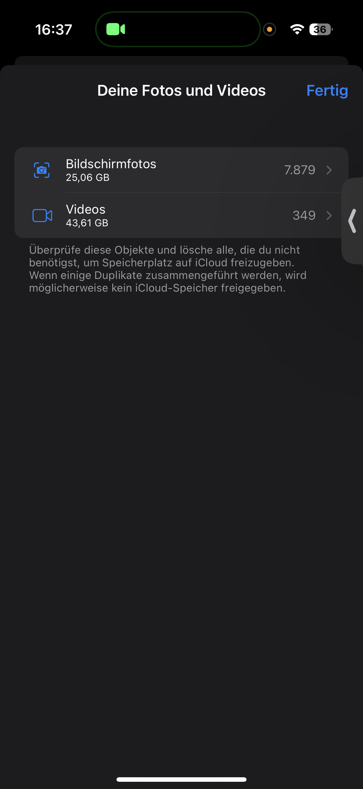 Beim Aufräumen wurde mir in den Einstellungen der Vorschlag "Fotos und Videos überprüfen gemacht". Dort wird davon gesprochen, dass ich ca. 68GB an "doppelten Fotos und Videos habe" (siehe Bild). Beim Anwählen der Option werden mir gezielt 349 Videos vorgeschlagen, die 43.61GB umfassen. Insgesamt habe ich ca. 3000 Videos (laut Fotos App). Das heißt es wurden gezielt diese 349 Videos vorgeschlagen. Beim Vergleich mit der Fotos App liegen diese 349 Videos jedoch nicht doppelt vor, es sind also keine Duplikate. Die Duplikate habe ich in der Fotos App extra bereits zusammengeführt.