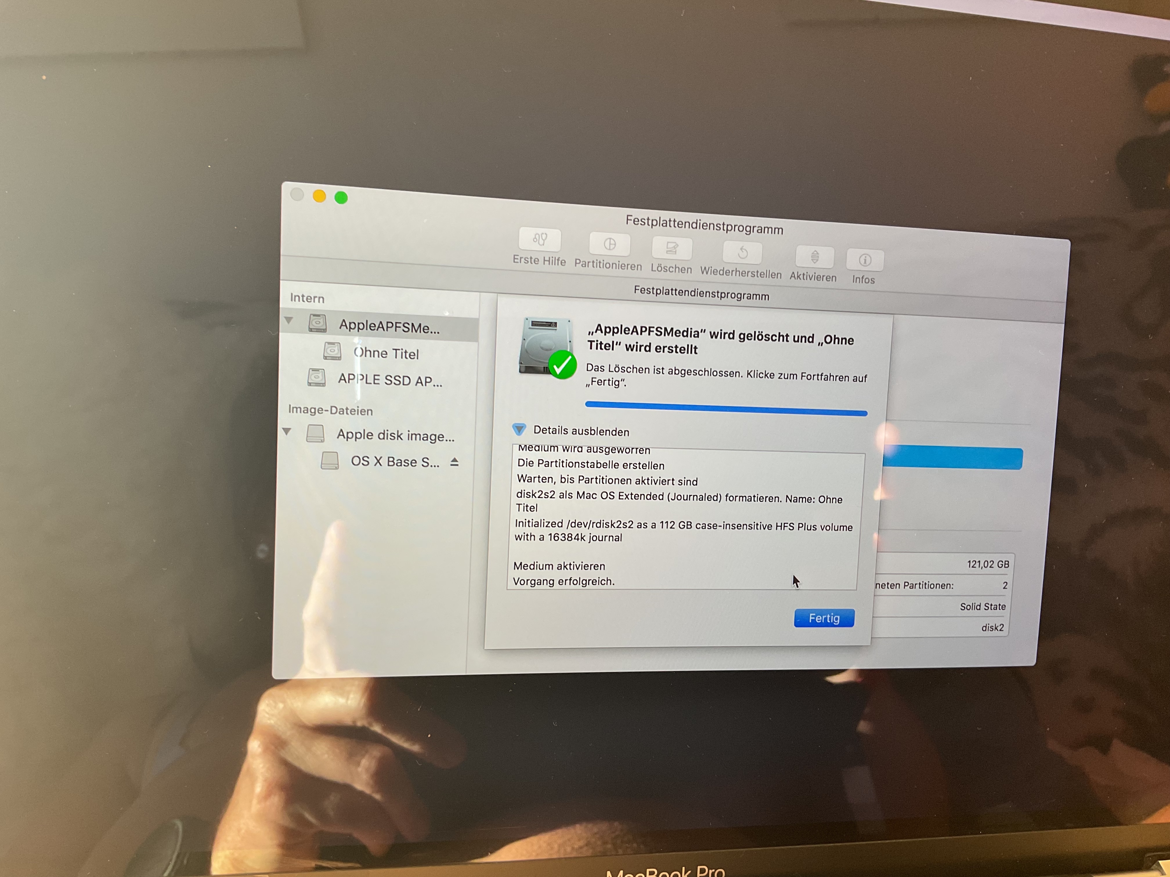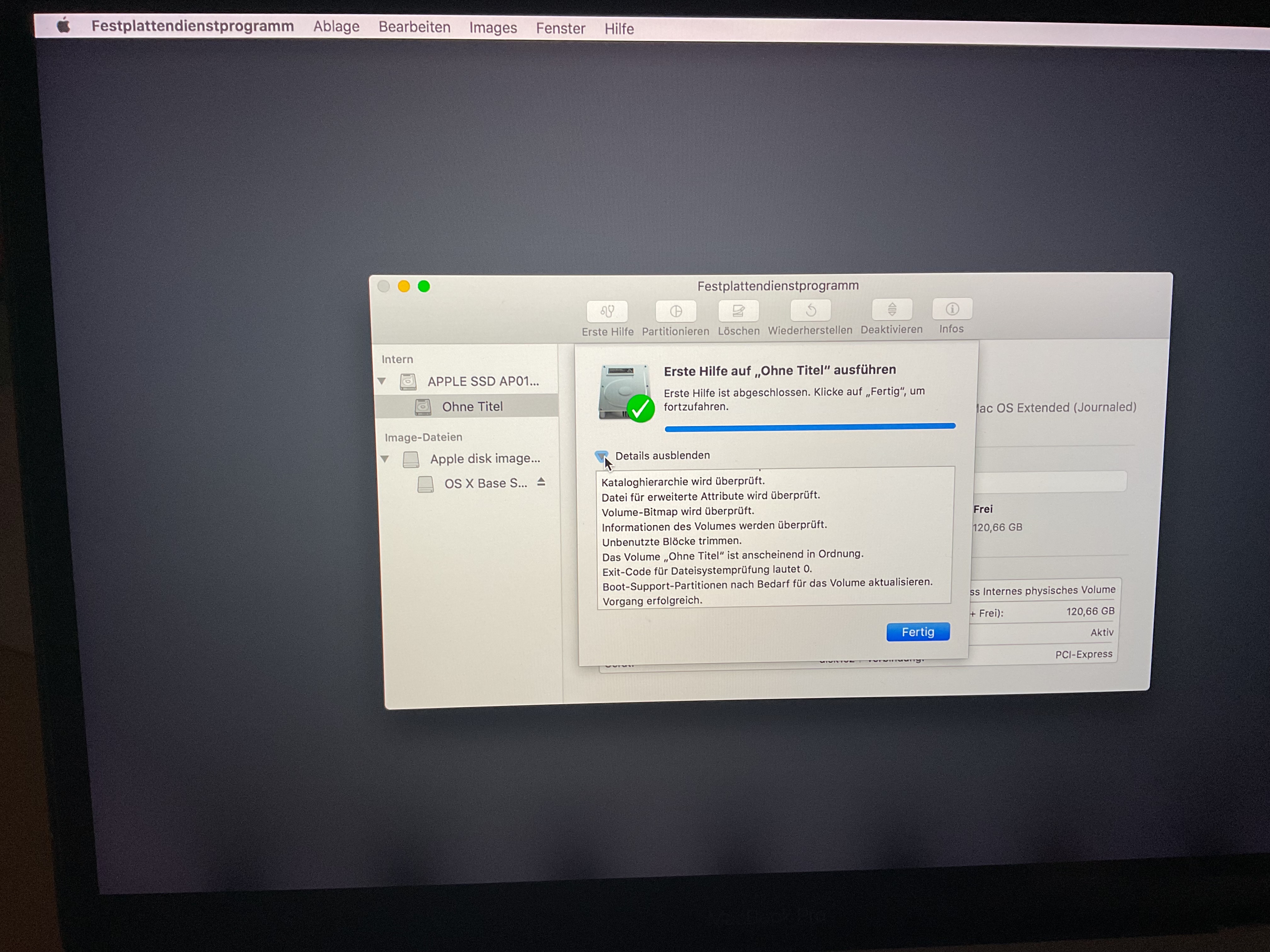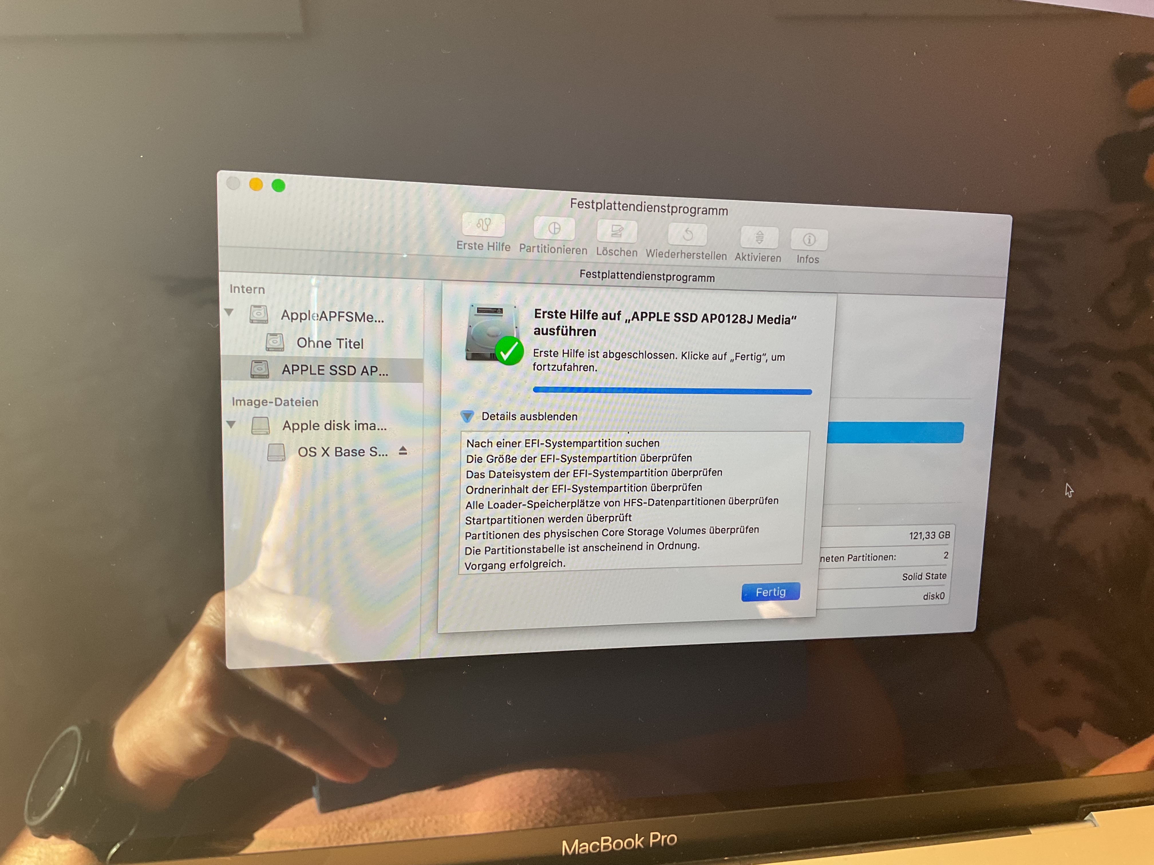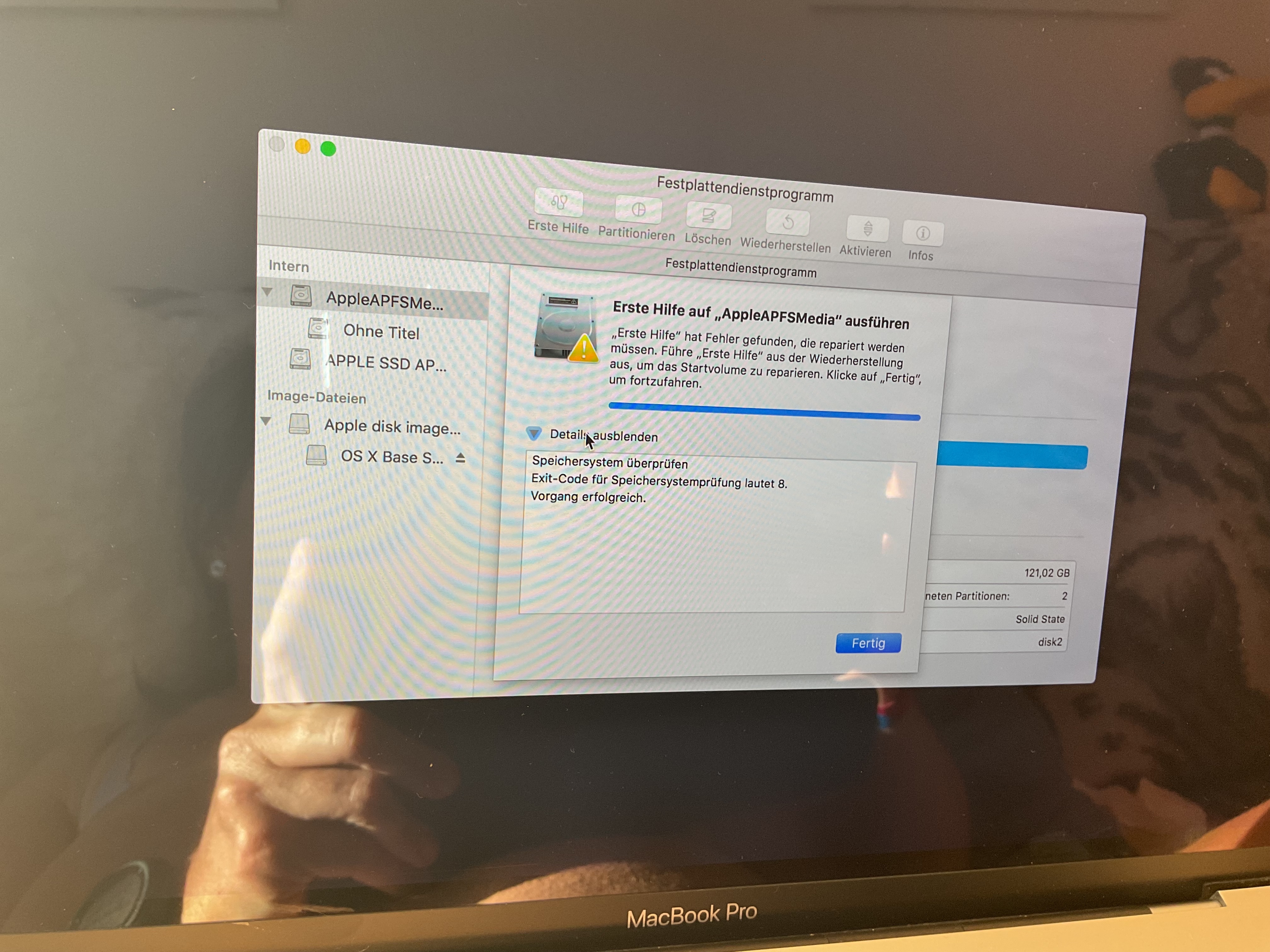 Festplattendienstprogramm bekomme ich eine Fehlermeldung bei der Apple APFS Media Exitcode für Speichersystemprüfung lautet 8. Alle anderen wurden überprüft waren nur bei SSD kam eine Fehler siehe Foto. Habe bei der FP Apple APFS Media schon mehrfach Löschen Format Mac OS Extended ( Journaled ) , Schema GUID ausgeführt. Das funktioniert auch, bei Erste Hilfe erscheint aber weiter der Fehler Exit 8. Hat wer eine Idee? Vorher ging alles aber wir wollten halt das Konto meiner Tochter löschen. Weiß leider nicht mehr weiter was ich noch machen kann.