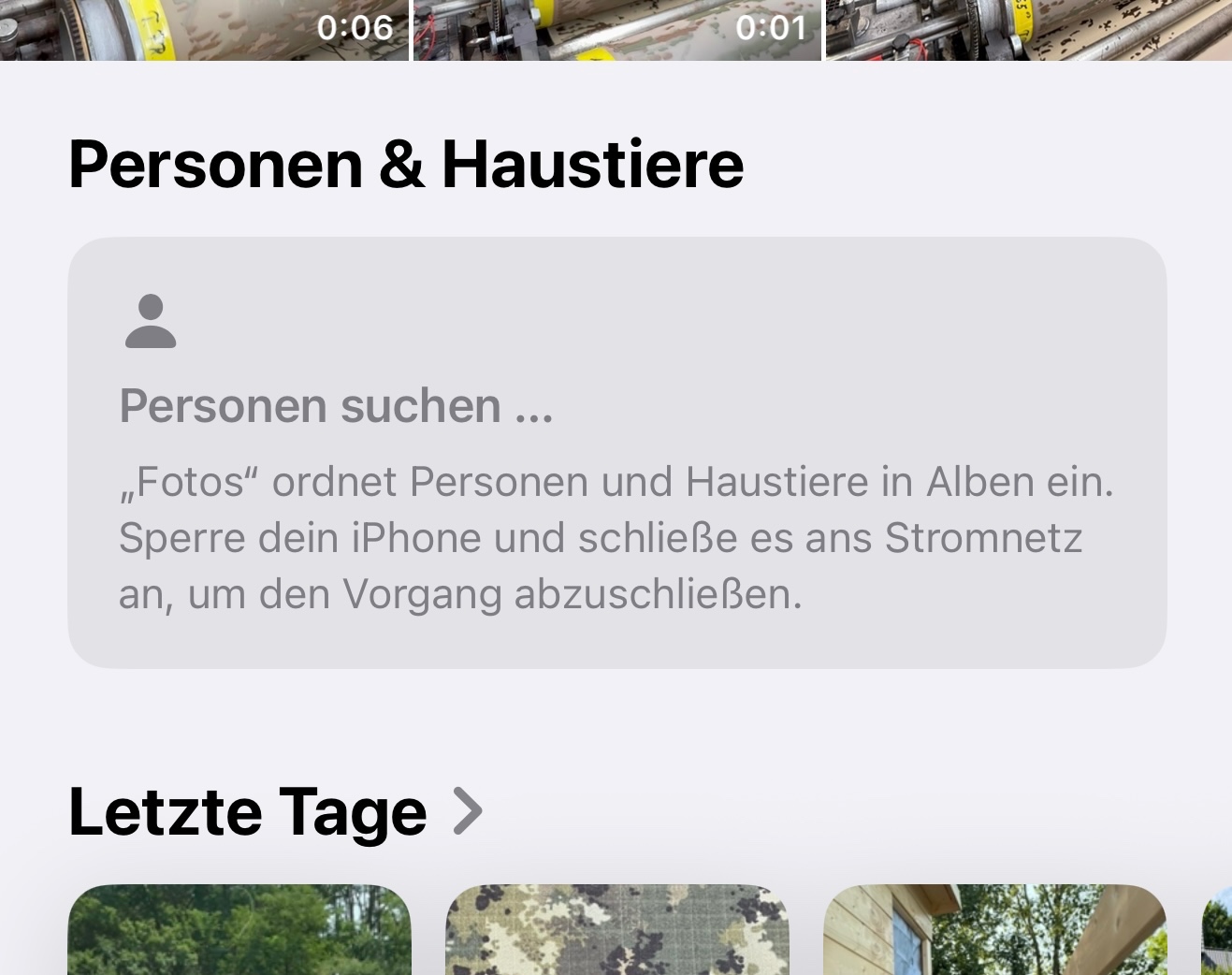 Handy ist jede Nacht angeschlossen und auch im WLAN. Es passiert aber nichts. Wenn ich die App Fotos öffne, sehe ich für eine Sekunde Bilder unter dem Reiter Personen & Haustiere. Dann verschwinden die Bilder und es steht wieder der Text da.