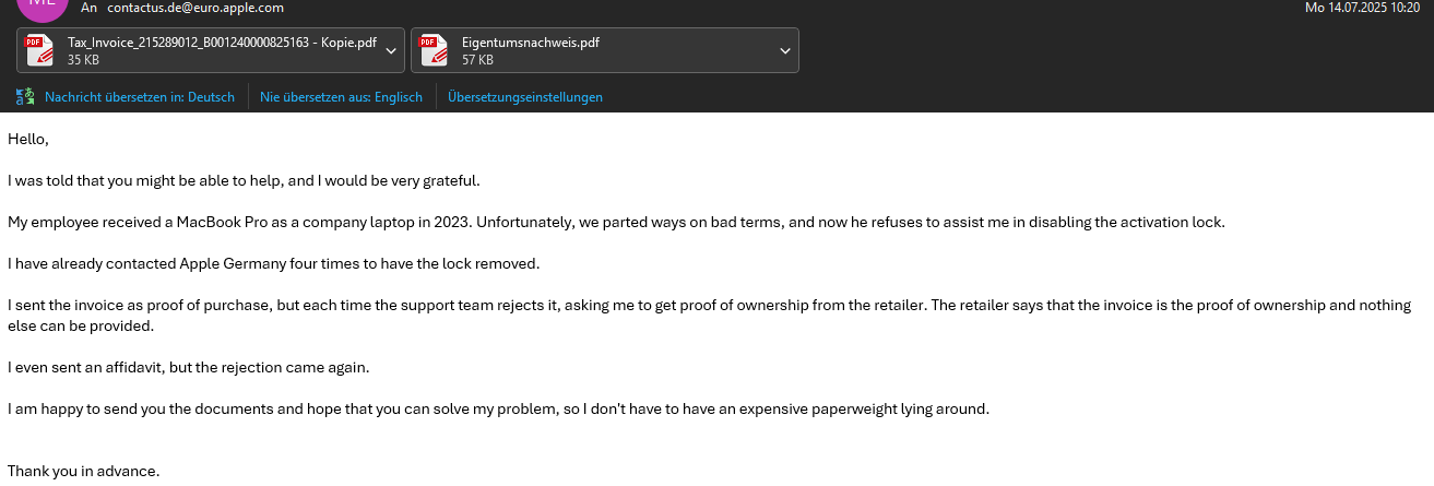 vielleicht habt ihr ja noch eine Idee. Ich habe hier ein MacBook eines ehemaligen Mitarbeiters, welches mit der Aktivierungssperre gesperrt ist. Da ich die Apple ID Daten nicht kenne und der MA mir diese nicht geben will habe ich mich an Apple gewandt, um die Aktvierungssperre entfernen zu lassen.