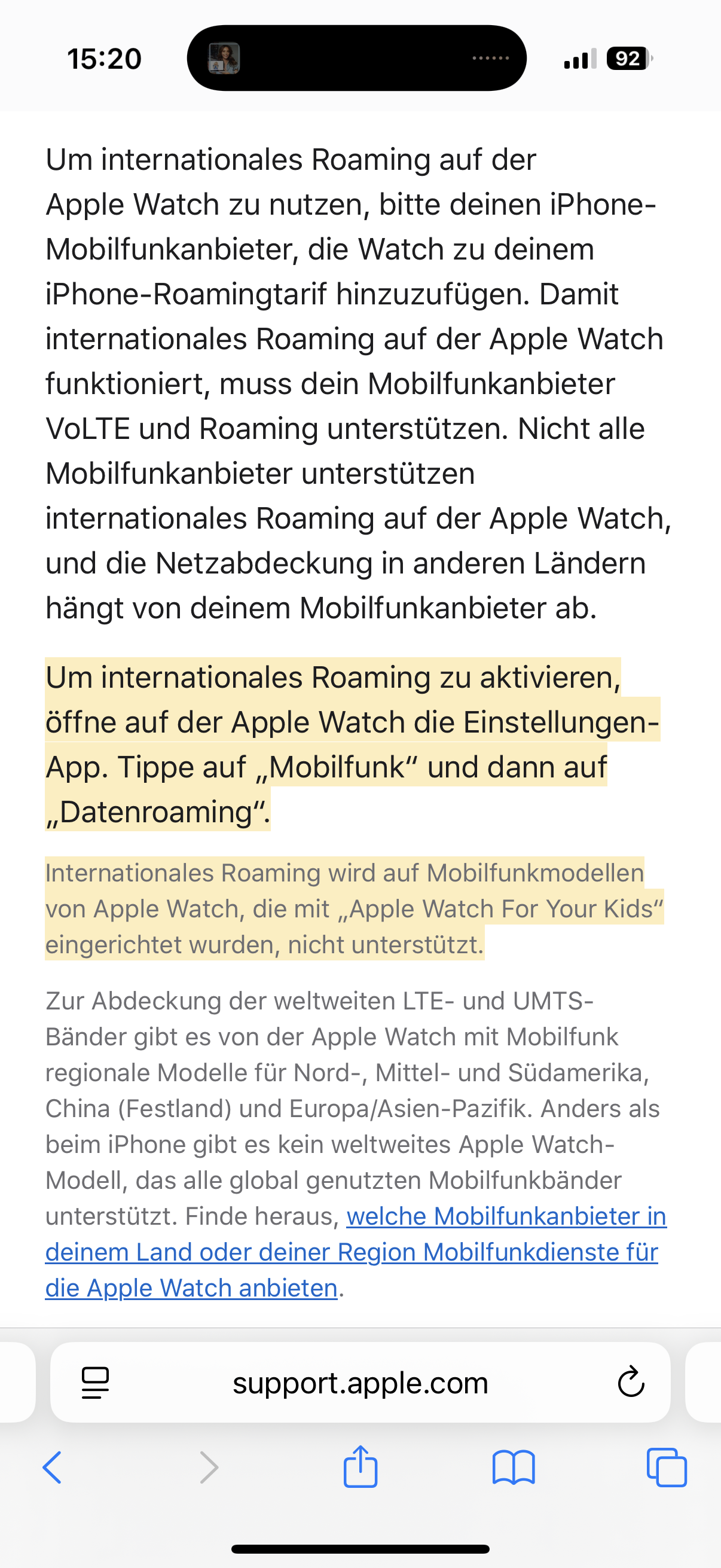 Der Mobilfunk-Vertrag, den ich dafür nutze, unterstützt International Roaming. Im Apple Support finde ich nun den Hinweis, dass International Roaming von Apple nicht unterstützt wird, wenn die Watch mit „Apple Watch for your Kids“ eingerichtet wurde.