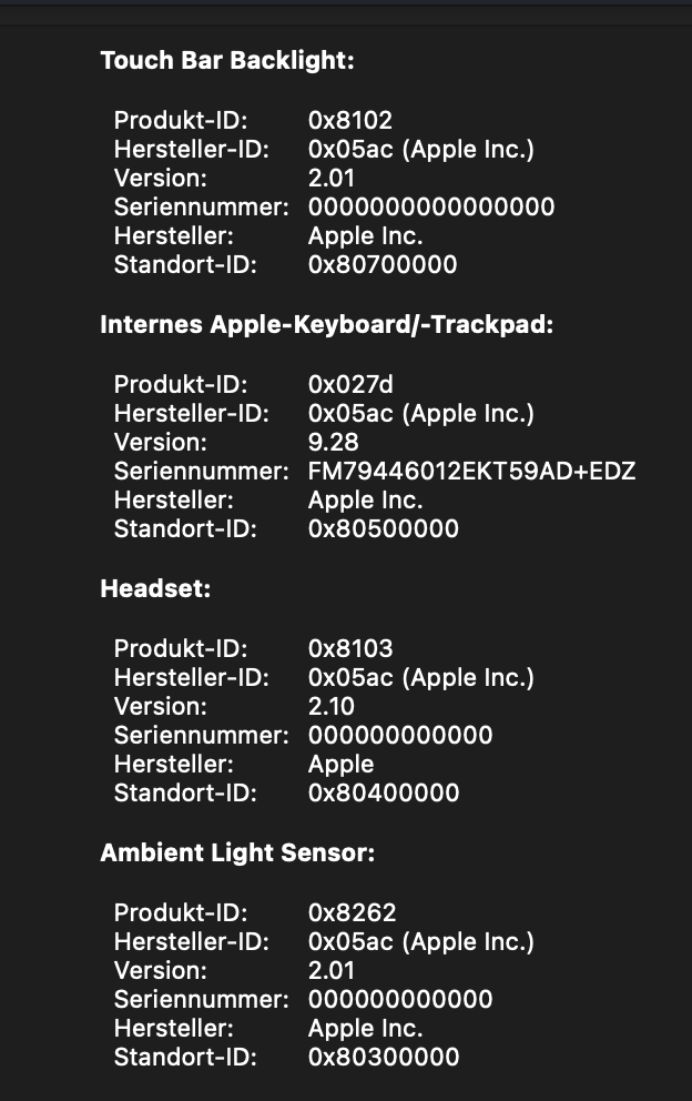 Hey, so recently my MacBook's Touch Bar, Ambient Light Sensor, something called "Headset" and the T2 Controller lost their Serial Number - which resulted in those things being useless and not activating anymore.