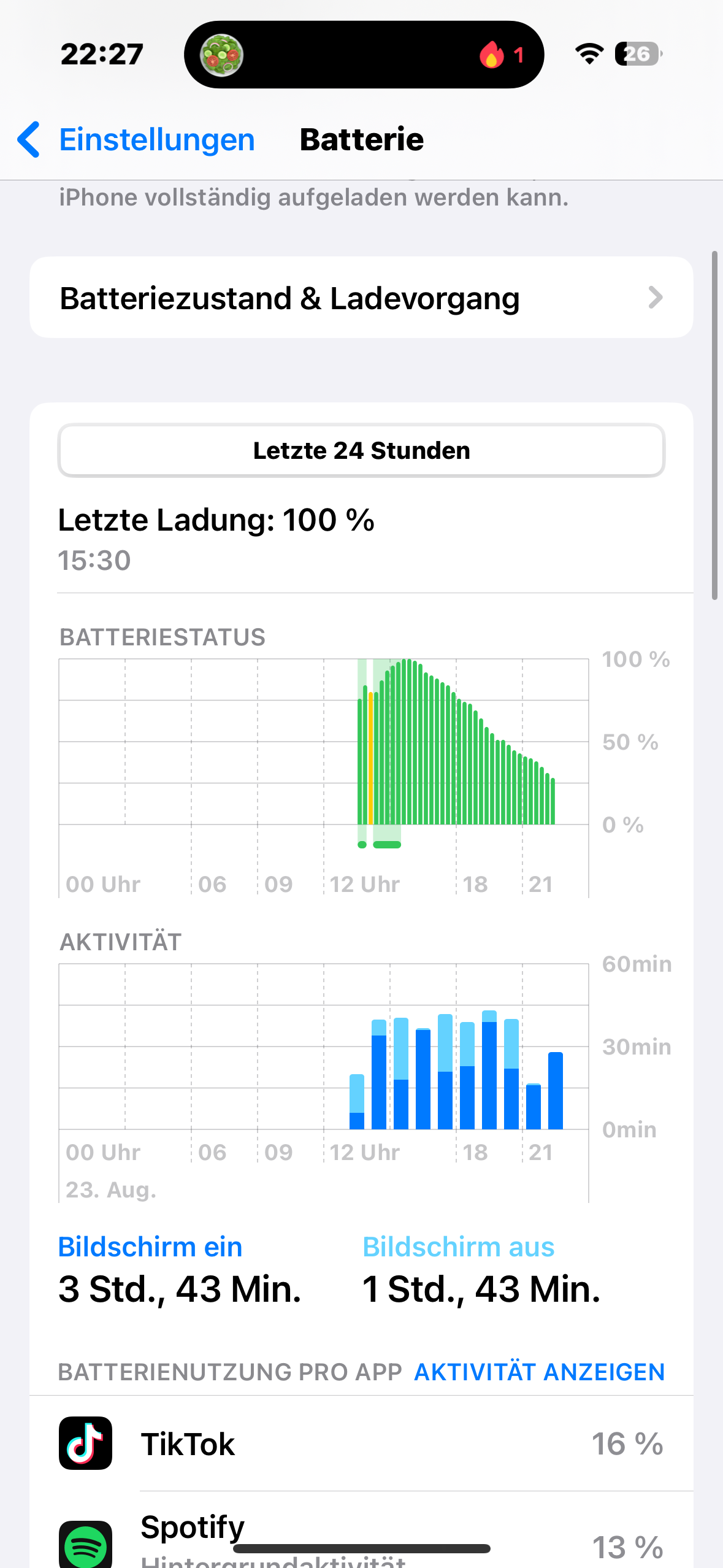 Hier eine kurze Ansicht nur von heute 1 Std bildschirmzeit, habe nur noch 60% von 100%.