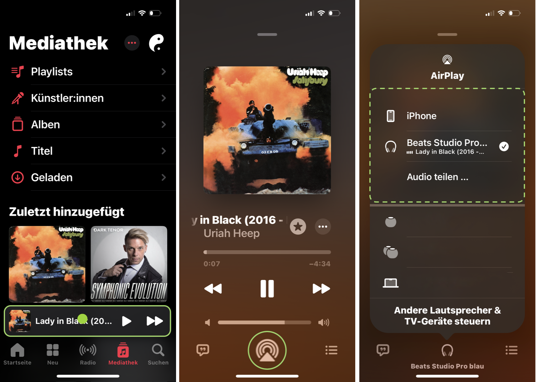 Wenn du die Musik-App öffnest und einen Musiktitel abspielst, kannst du unten auf dem Display auf den aktuellen Titel Tippen. In der vergrößerten Darstellung kannst du findest du unten das vergrößert dargestellte Symbol