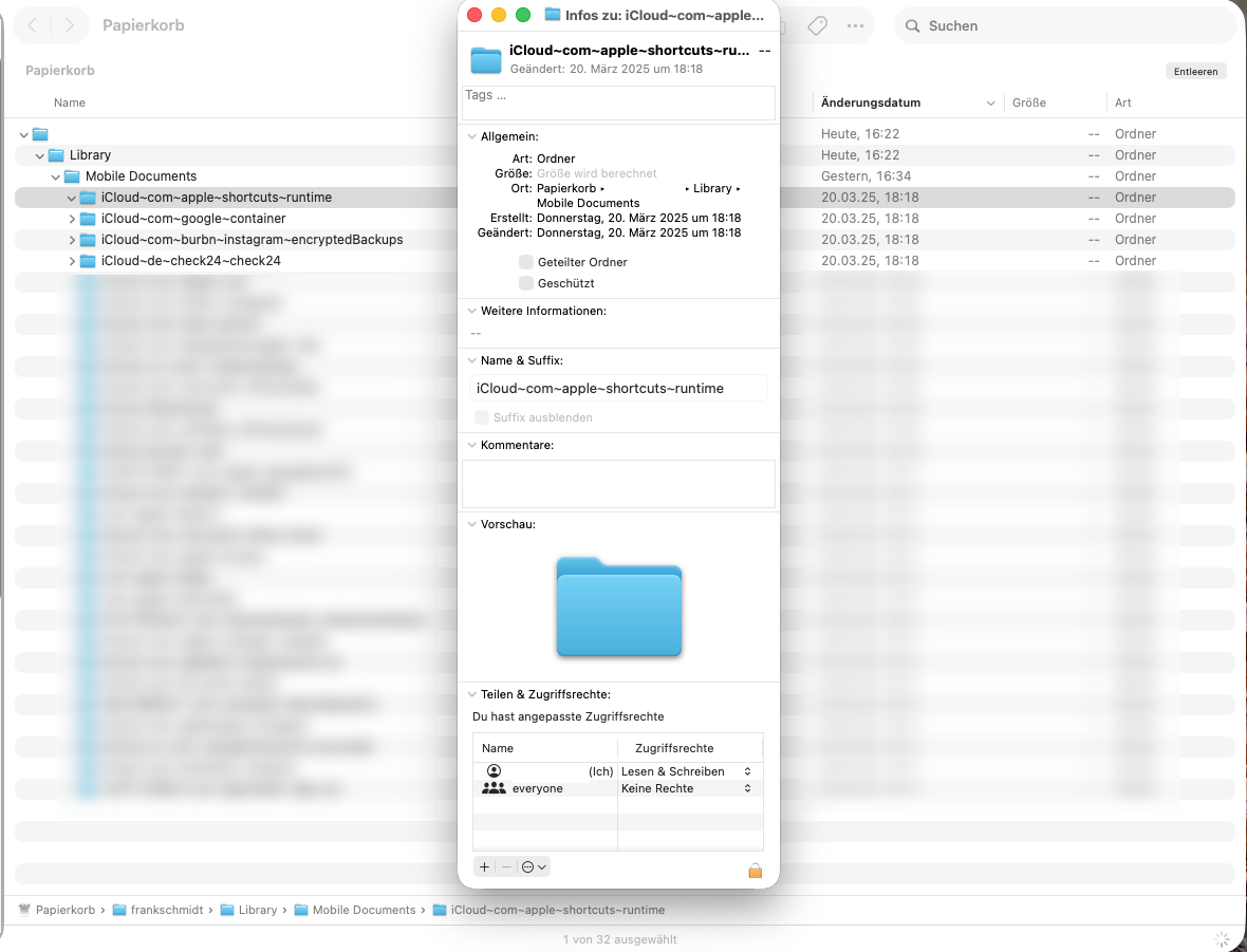 ich habe ein MacBook M4 Pro und habe von einem alten (gelöschten) User unsichtbare Dateien aus "Library/Mobile Device" im Papierkorb – die Dateien haben mit iCloud was zu tun und ggf. deswegen schwierig löschbar da iCloud da vielleicht die Hände drauf hat.