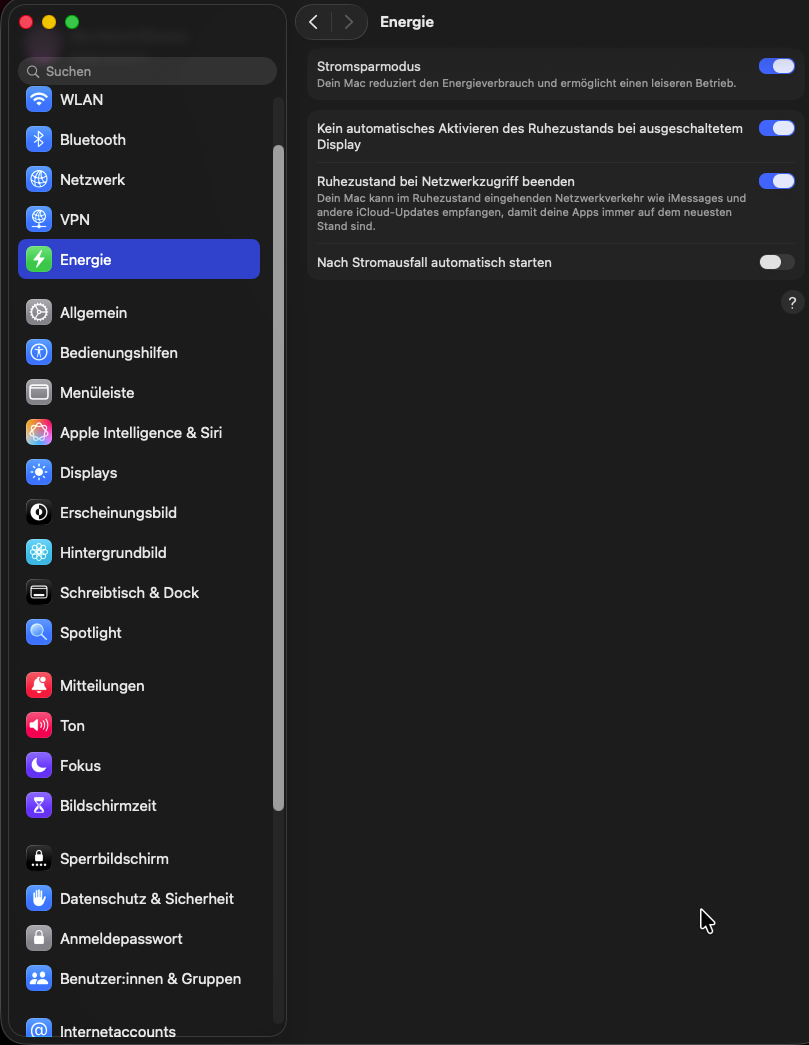 Unter Netzschalter verstehe ich den haptischen Ein-/Ausschalter Tastknopf (Button, Touch ID) am MacBook. Meine Erfahrungen gründen auf einem Dell Laptop bzw. auf dem Mac mini M2, der einen Stromsparmodus enthält, vergleiche bitte: