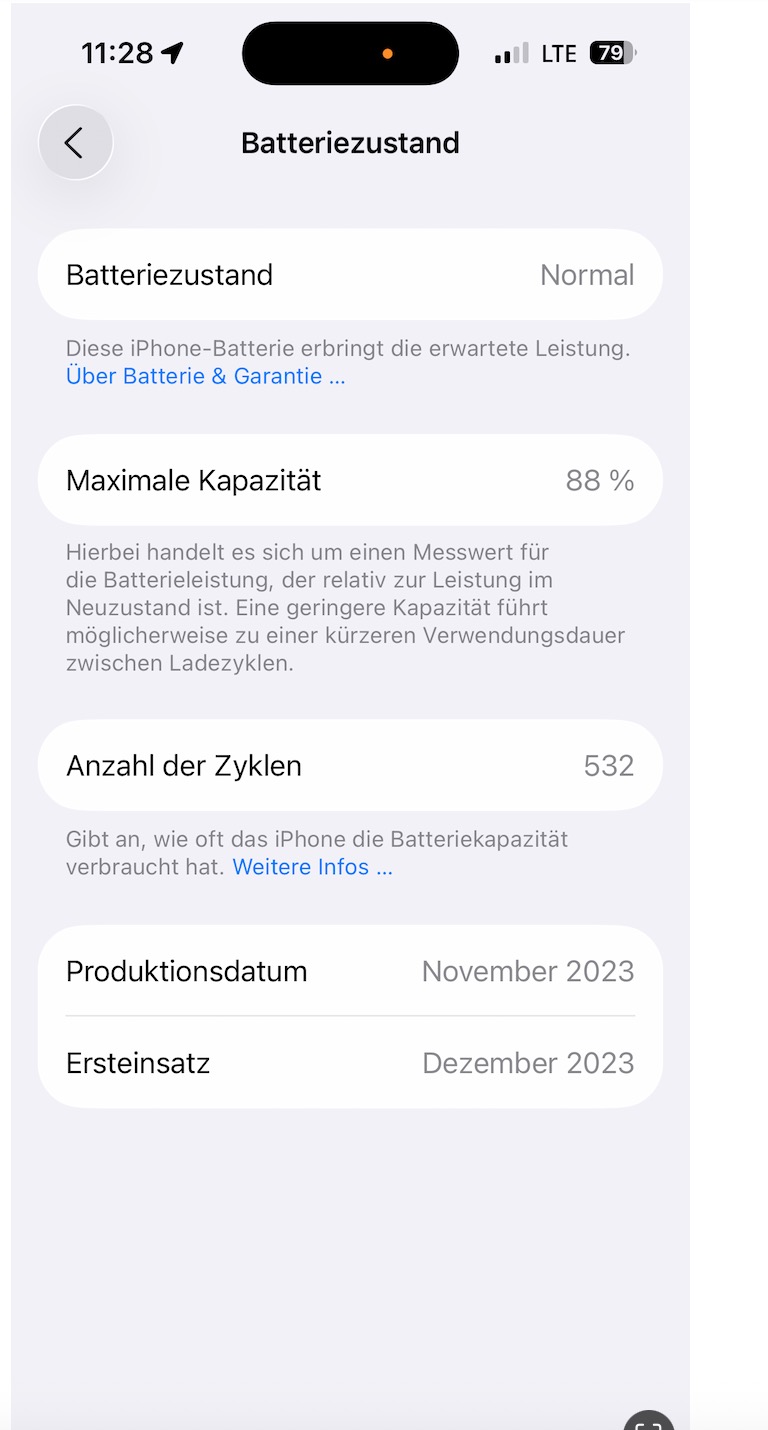 Hi, mein IPhone 15 hat nach 375 Ladezyklen eine maximale Kapazität von 89%, das Ladelimit ist auf 80% gesetzt, es ist 12 Monate alt, Display hat niedrige Helligkeit. Ist die Kapazität normal? Thx.