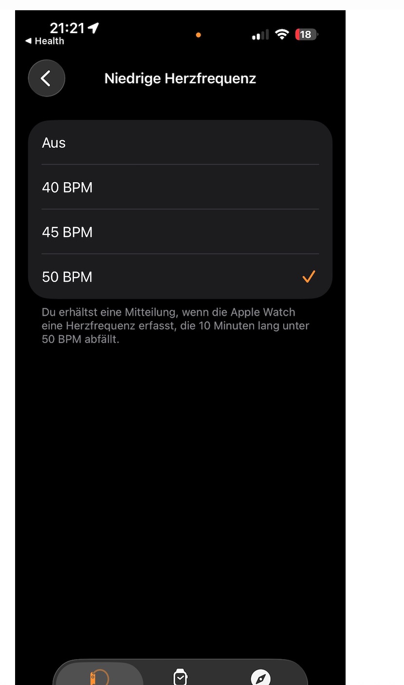 Meinen Schwellenwert für die Anzeige Mitteilungen bei niedriger HF habe ich auf 40 eingestellt - auf Watch und iphone. Ich bekomme dauernd Mitteilungen bei HF 48 oder 49.