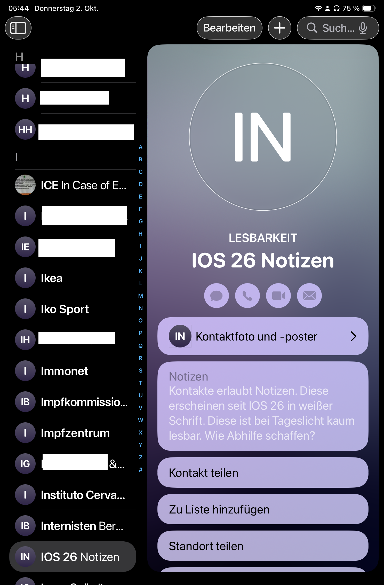 Kontakte erlaubt Notizen. Diese erscheinen seit IOS 26 in weißer Schrift. Diese ist bei Tageslicht kaum lesbar. Wie Abhilfe schaffen?