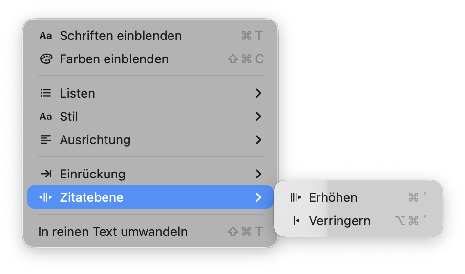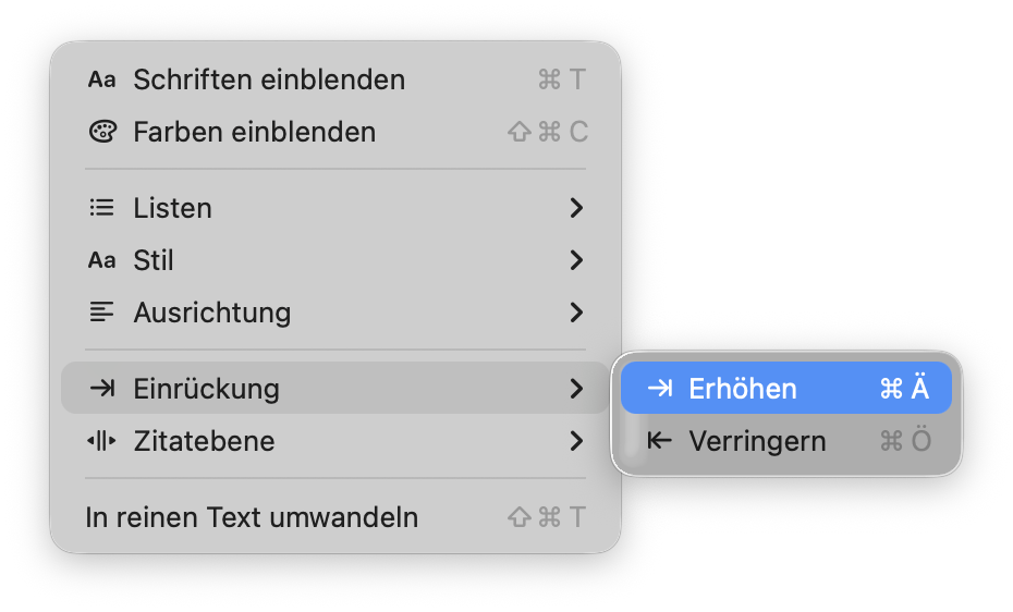 Dadurch, dass bei "Einrückung erhöhen" und "Zitatebene erhöhen" der Text "Erhöhen" und "Verringern" derselbe ist, kann ich in den Systemeinstellungen nicht speziell den Tastaturbefehl für "Zitatebene erhöhen" ändern.