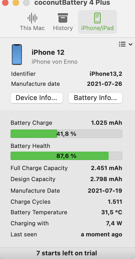 Aber man muss bei einem Iphone 12 die Zyklen am PC auslesen. Aber diese werte sind echt. Das lässt sich gut googlen.