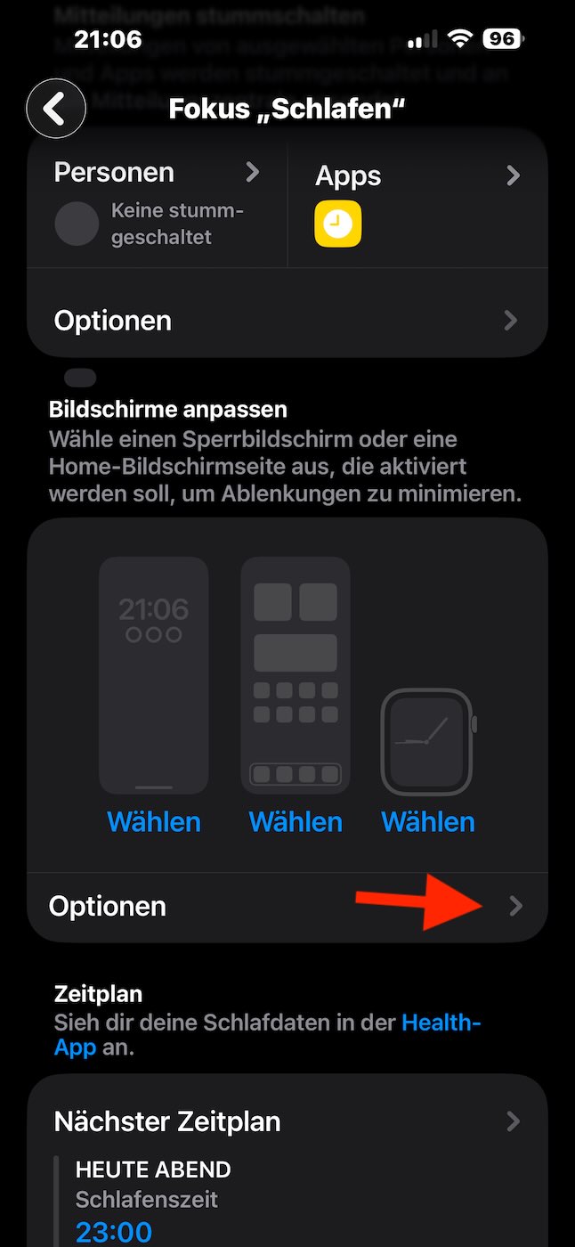 unter "Bildschirme Anpassen > Optionen" das Häkchen bei "Schlafbildschirm" entfernt, damit sich auf den Geräten der Bildschirm über Nacht nicht ändert und alle minimalistischen Bildschirme für den Schlaf Fokus abgestellt.