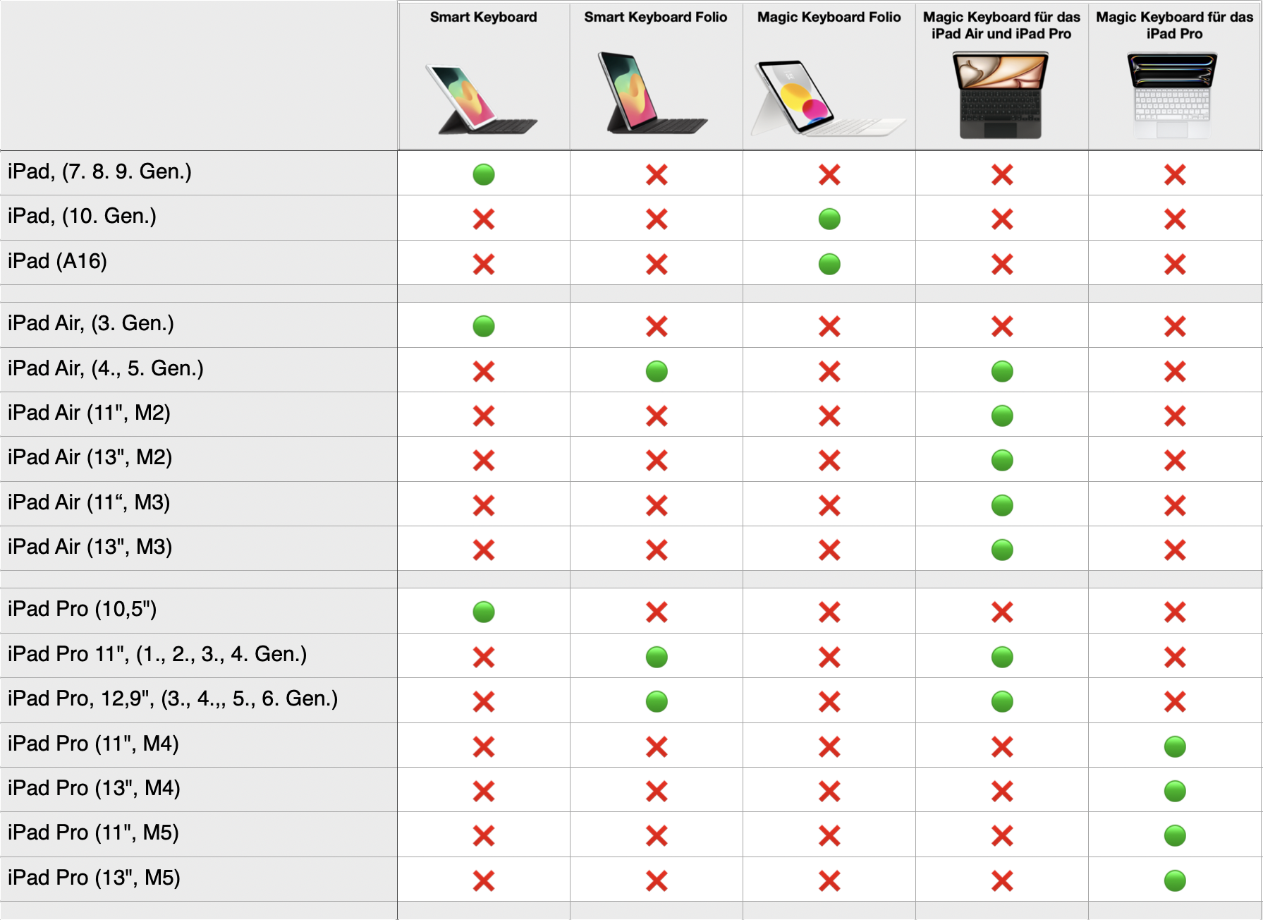 ❌ bedeutet, iPad und Tastatur sind nicht kompatibel.
