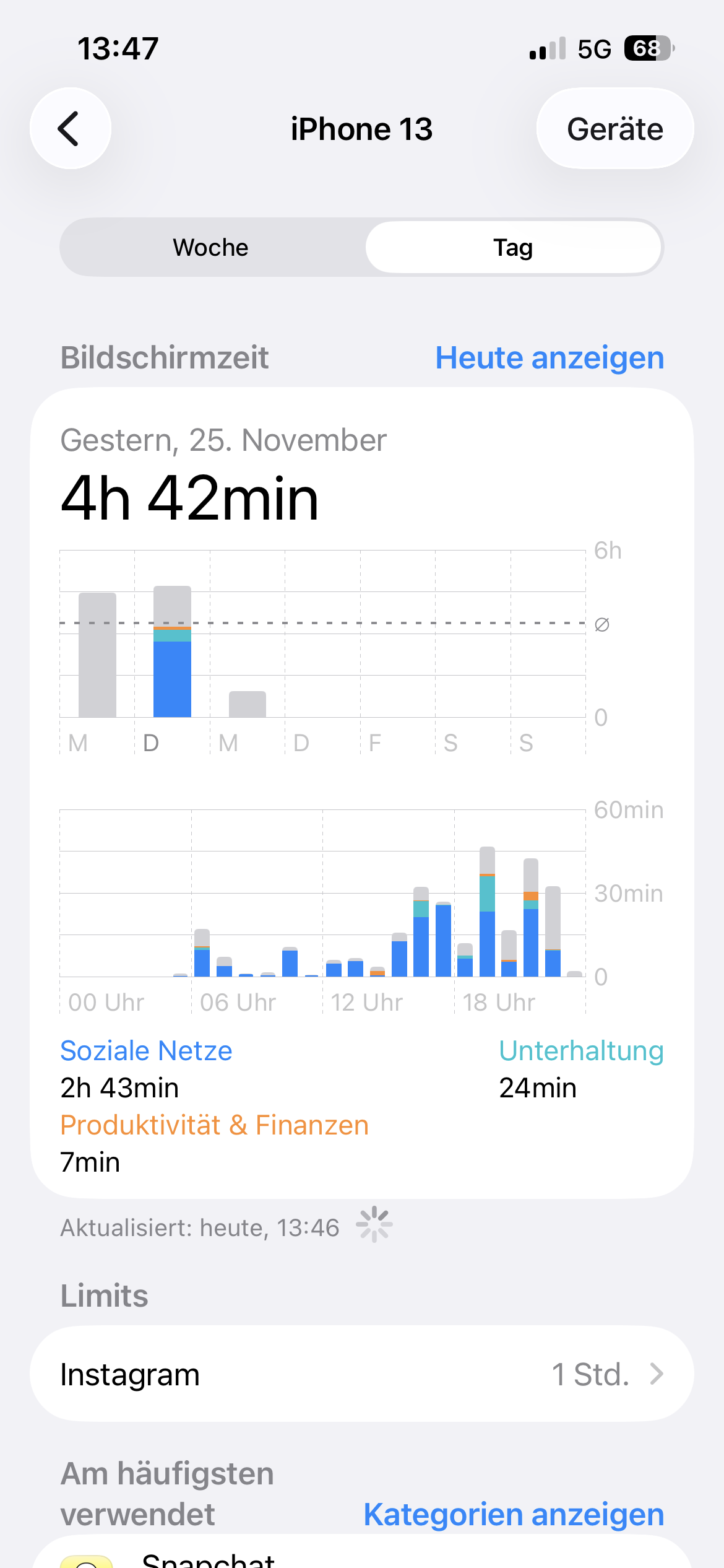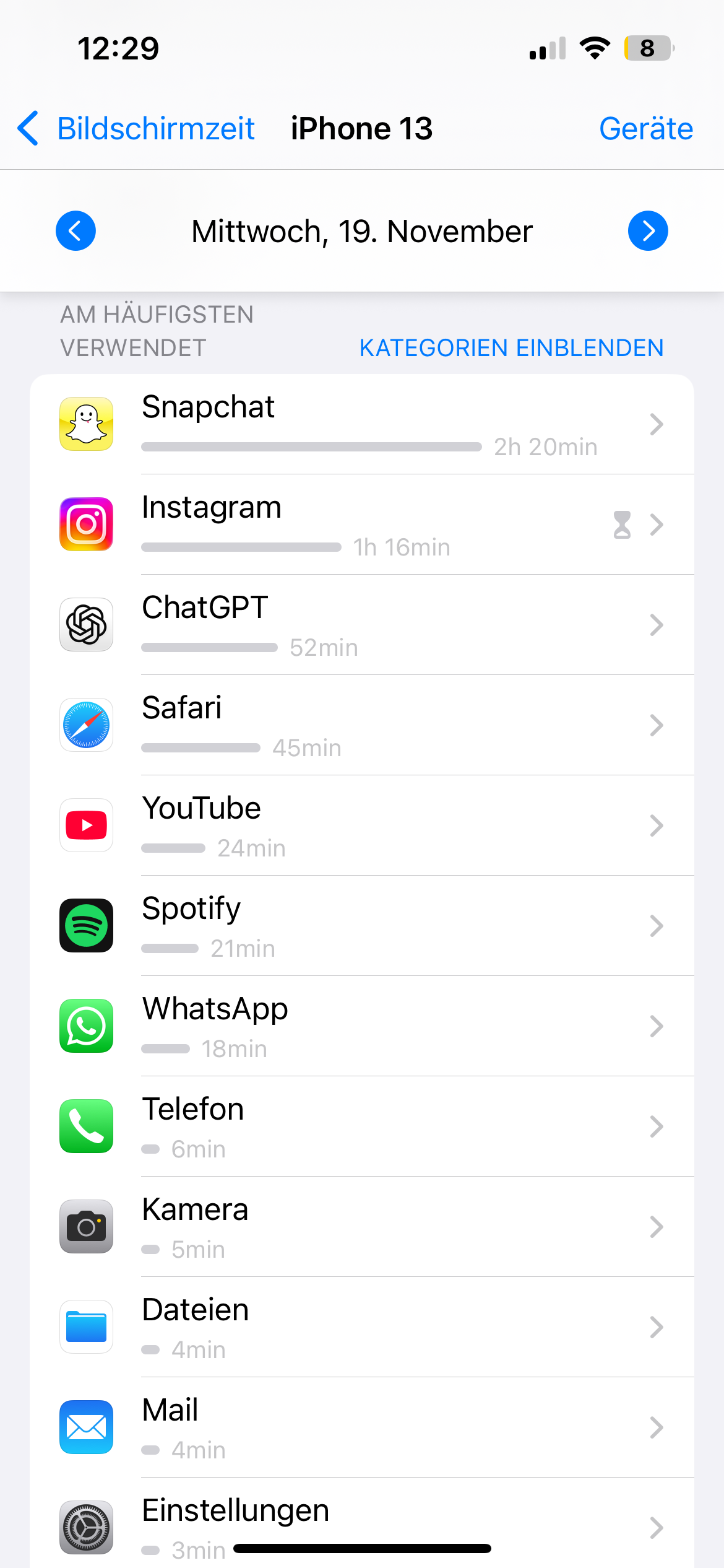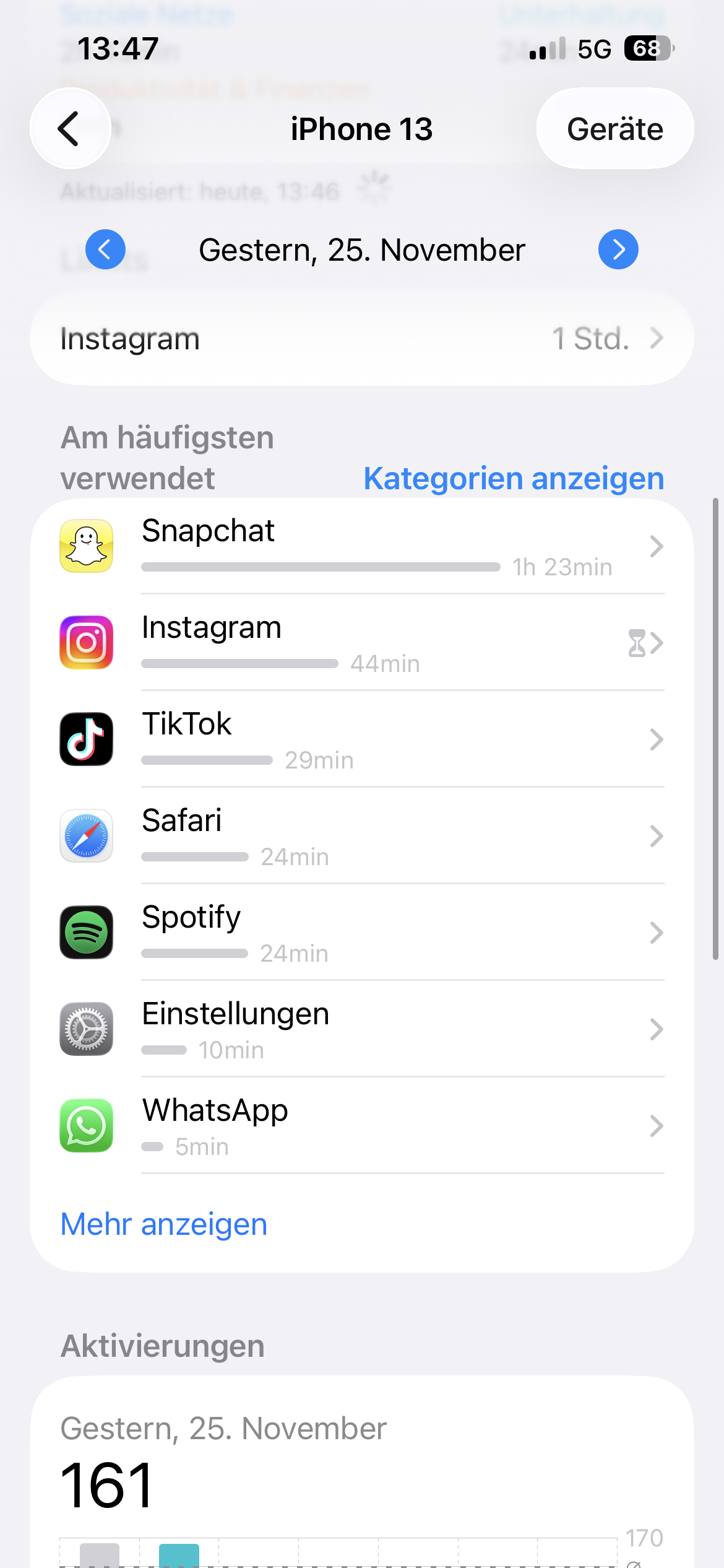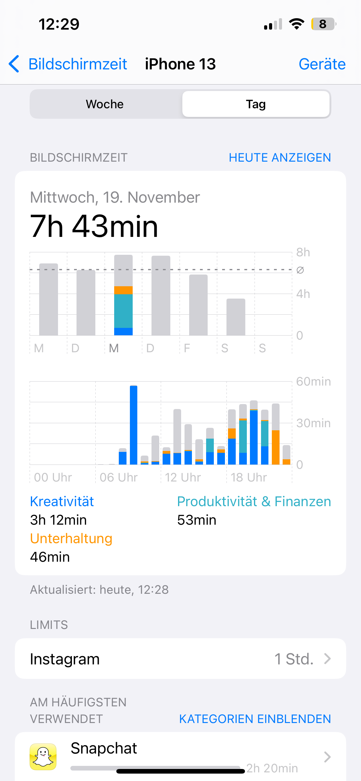 Das Problem ist das meine Bildschirmzeit falsch angezeigt wird. Das heißt wenn ich aus den Apps welche und angezeigt werden die Zeiten addiere komme ich nicht auf die gesamt Bildschirm Zeit welche immer 2-3 Stunden mehr sind als das Ergebnis wenn man die einzelnen Zeit der einzelnen Apps zusammen rechnet.