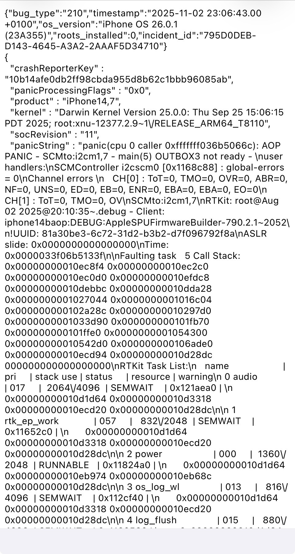 Schau‘ bitte mal nach, ob du unter Analysedaten einen panic-full-Report findest. Die ersten 1-2 Seiten bitte als Screenshot posten (bitte nicht den ganzen Report !).