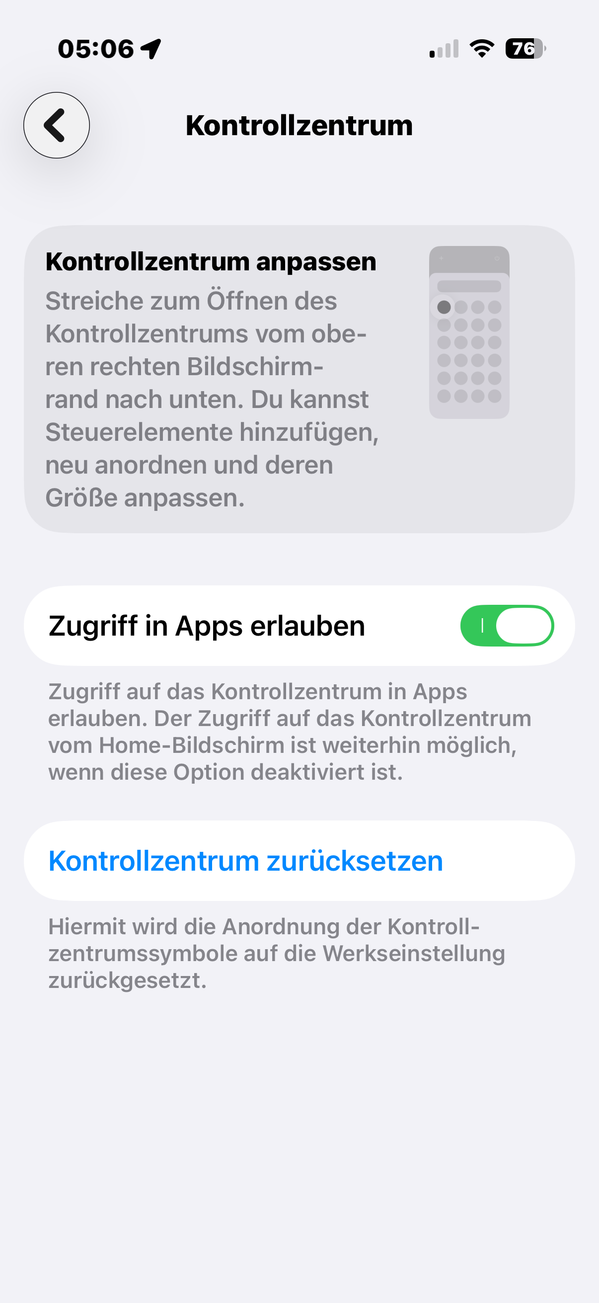 - Kontrollzentrum zurückgesetzt, alle gewünschten Elemente wieder zugefügt