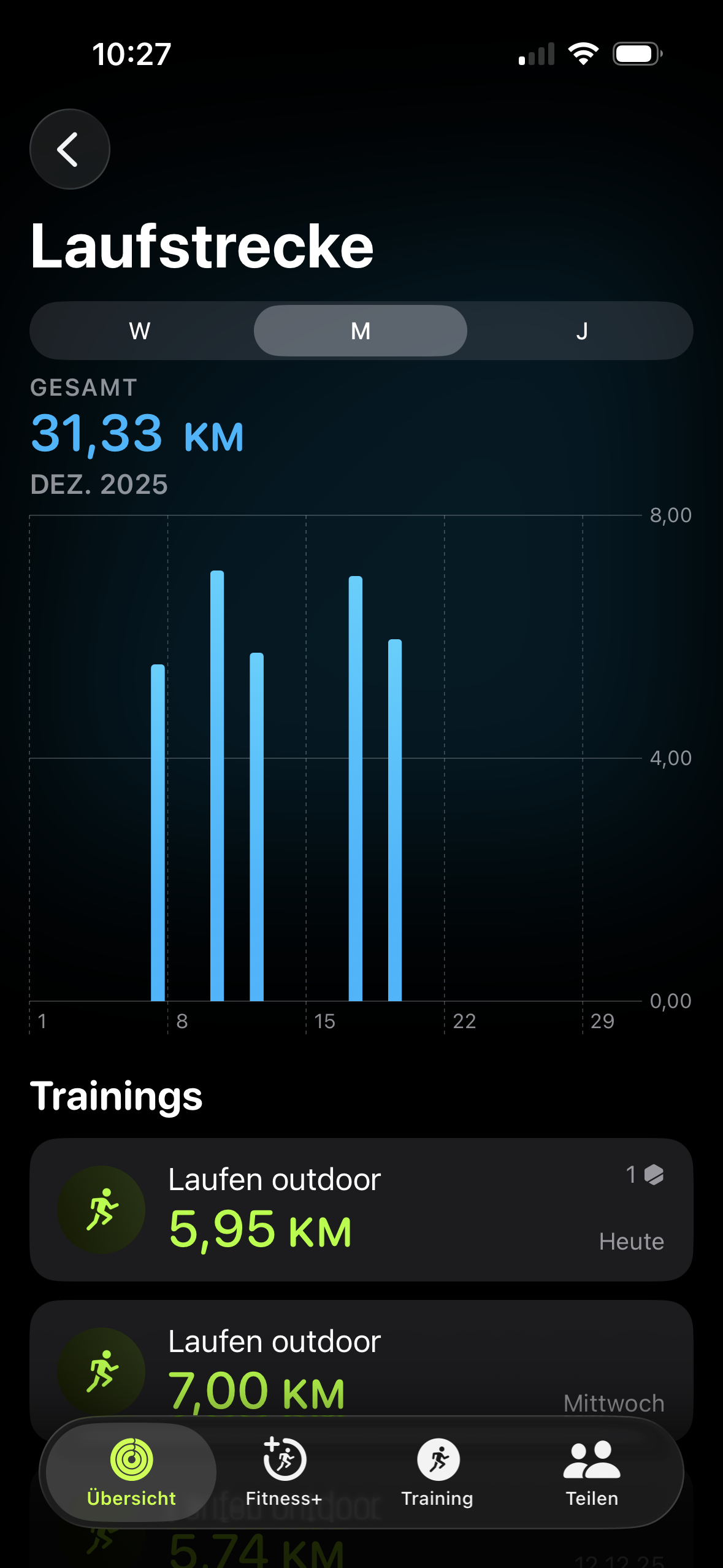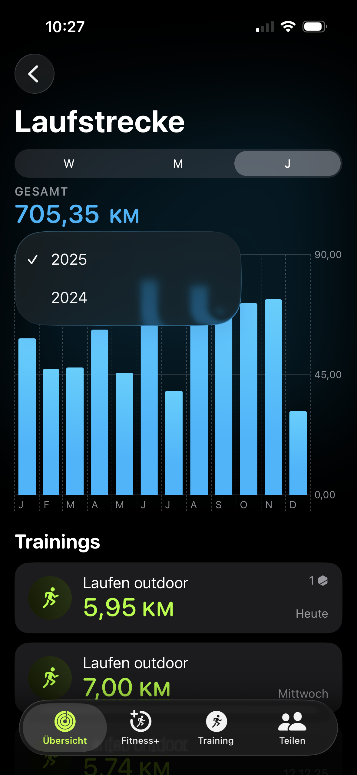 ich würde gerne in der Fitness App die Übersicht zu meinen Läufen auch für vergangene Monate anzeigen, nicht nur vom aktuellen Monat, wie das Foto zeigt. Geht das irgendwie? Wenn nicht, warum eigentlich nicht? Bei den Jahren gehts an der selben stelle ja auch (siehe Foto 2)