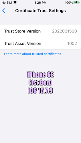 Earlier, iPhone 8, SE (1st Gen), iPhone 12 Pro & iPhone 13 Pro on iOS 15.6.1 also iPad Pro on iPadOS 15.6.1 all are with Trust Store Version: 2022031500 and Trust Asset Version 17