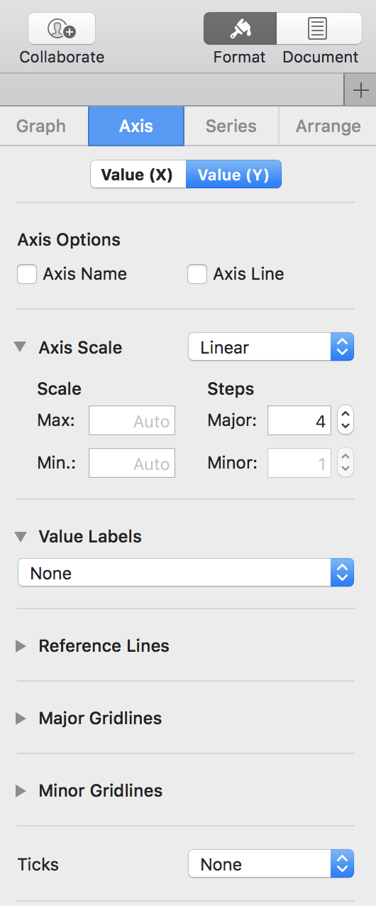 I am trying to make a chart, but I don't want the Y-axis value labels to appear on the chart (the numbers are completely arbitrary, and all I'm trying to show is a general trend). I can reduce it down to one number (the highest) but I can't delete or hide that number.