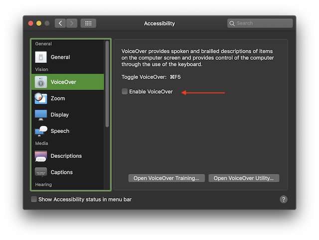 The Voiceover option is currently NOT toggled, yet it is still turning on when I restart my computer. I have toggled it on and back off (to see if that would fix anything), with no success.