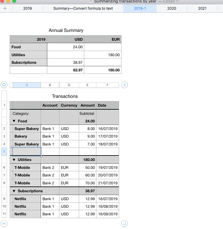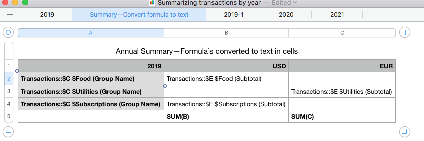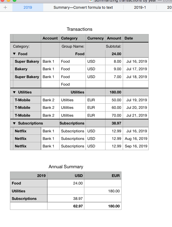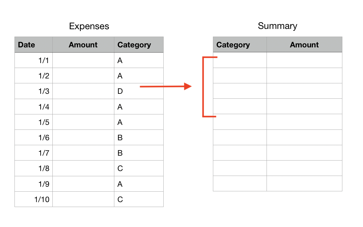 In one sheet I have a list of expenses with category. Categories are popup menu. I have thousands of lines of expenses, so I created another sheet to summarize annual expenses, but I have listed each category manually based on my popup menu list on the previous sheet.