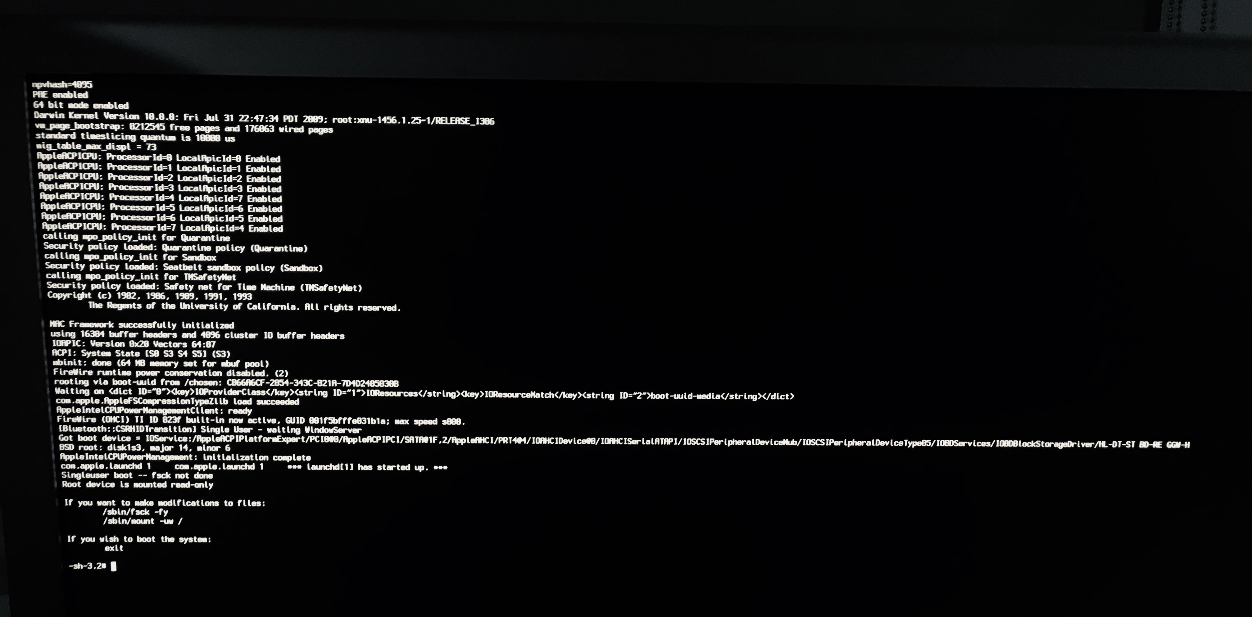 Ha! My thought exactly on the blue screen. It’s a different shade of blue and maybe the background color of my snow leopard desktop. As far as Start Up Manager...yes. It works just fine and never reboots and the same when in Single User mode. I decided to try a third hard drive and do a install from DVD snow leopard, but reboots and hangs. Here is an image of the Single User screen. And thanks for your response!
