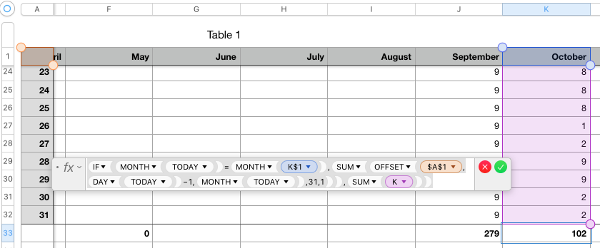 I tried SUMIFS, but the date definition with days in column and month in row doesn't seem to work in that function. Well, I couldn't make it...