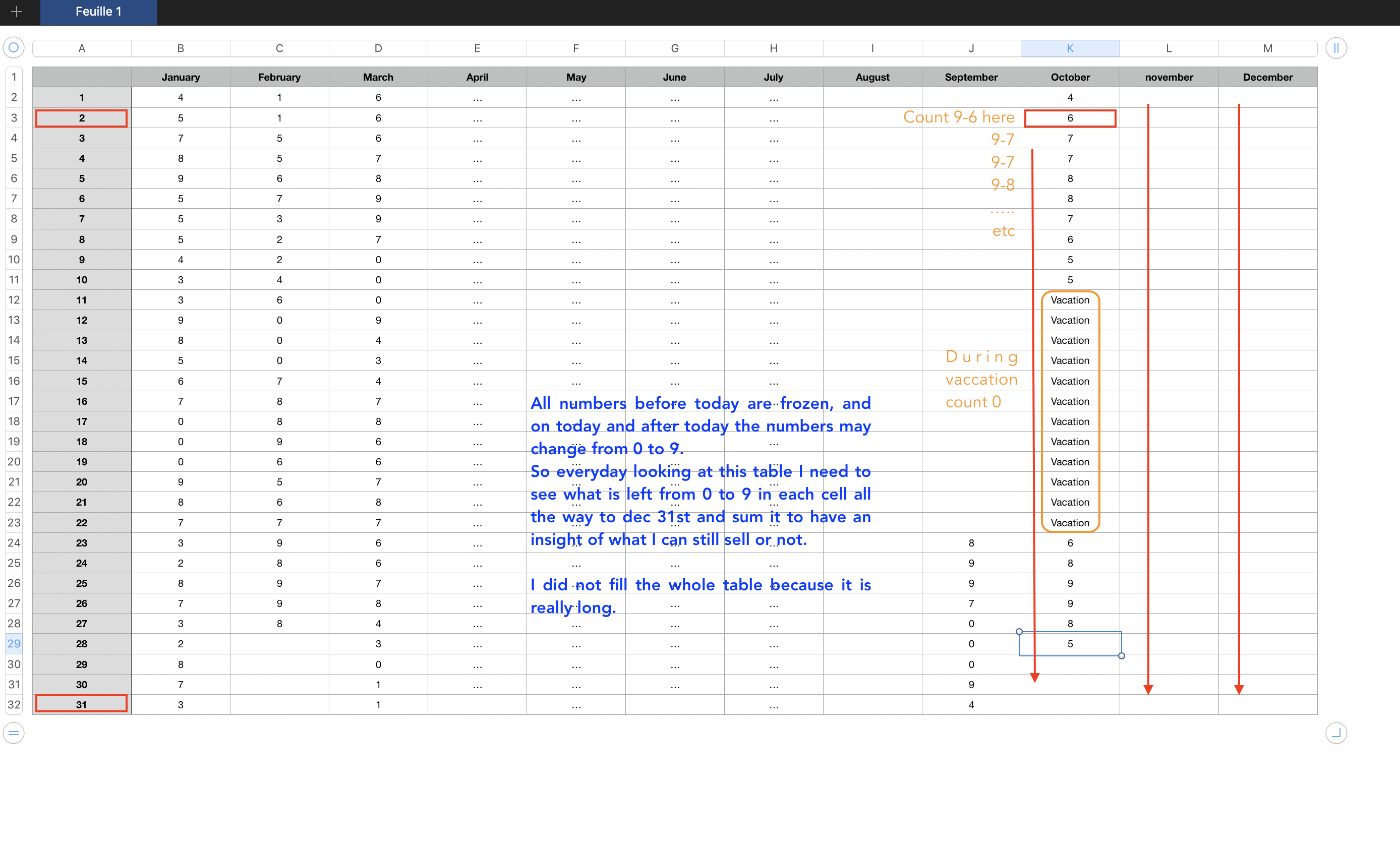 Between Today and 31 of december, the content of each cell minus 9 must be added considering that: