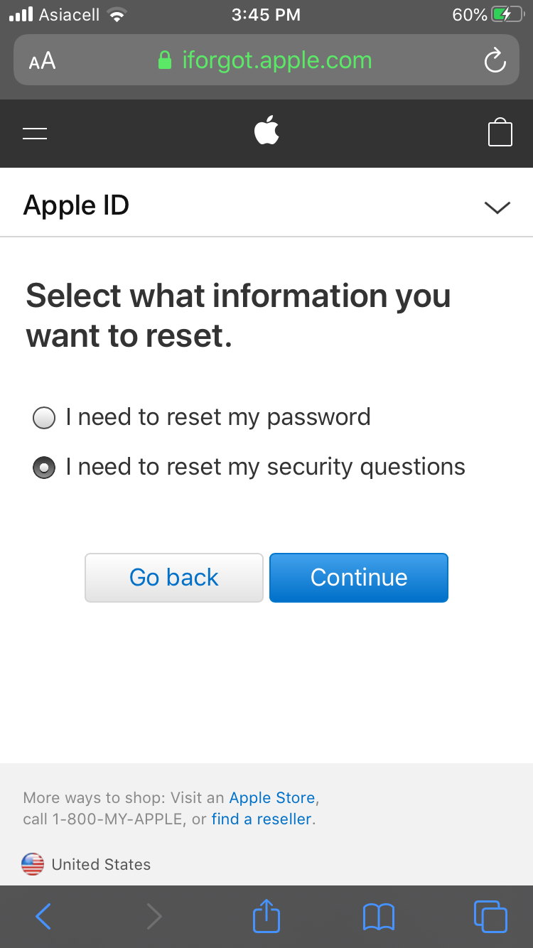 3. Choose the option to reset your security questions, then select Continue.