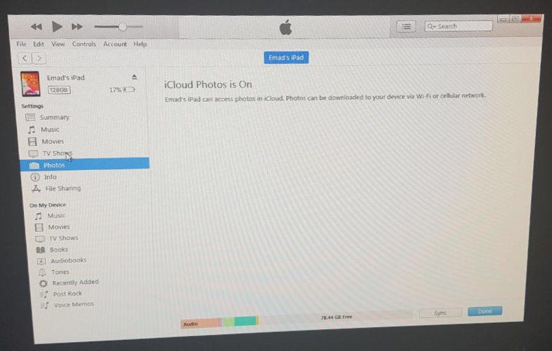 I'm trying to send pictures from my PC to my Ipad using iTunes app but in the picture section on the sidebar it doesn't allow me to proceed. (Notification: Emad's Ipad can access photos in iCloud. Photos can be downloaded via wifi) syncing options are not available in the page