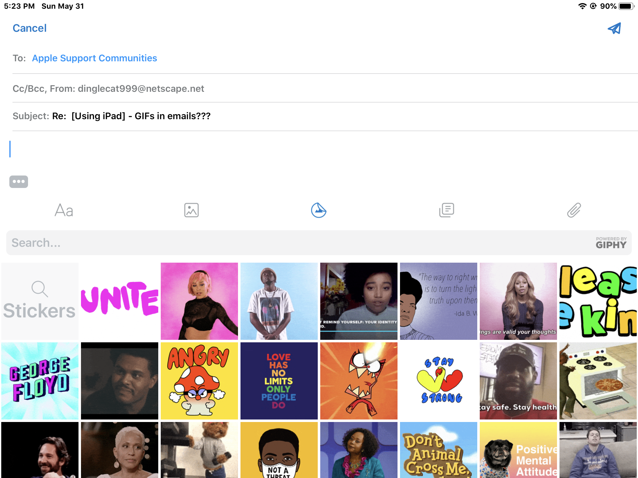 I can search for and add Gifs to messages I send in the iMessage app... but I do not see any way I can search for and send Gifs in the Apple Mail app on my iPad using iOS 13.4.1. Why not?