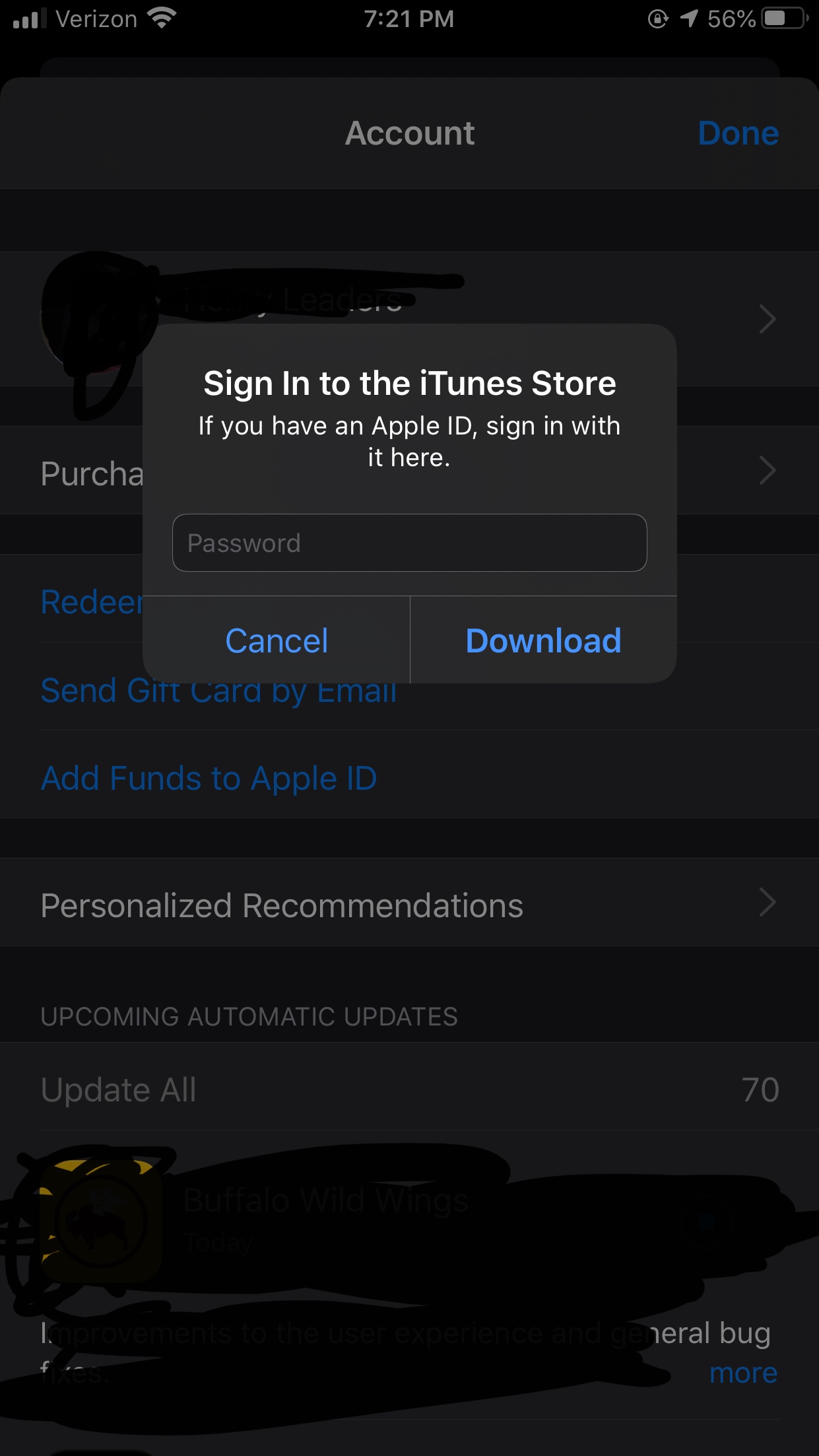 So I have been trying to update my apps all night and it keeps showing me the screen pictured below, and when I enter my password it prompts me to continue to settings to sign into my brother's icloud account. It is worth noting that my brother's icloud account is the Family Admin for family sharing, however my app store is logged into my icloud account. I don't know if this information also matters but I have parent/guardian status in the family sharing. I would like to be able to update my apps without needing a code from my brother every time, as we are both adults who have busy lives. Please help.