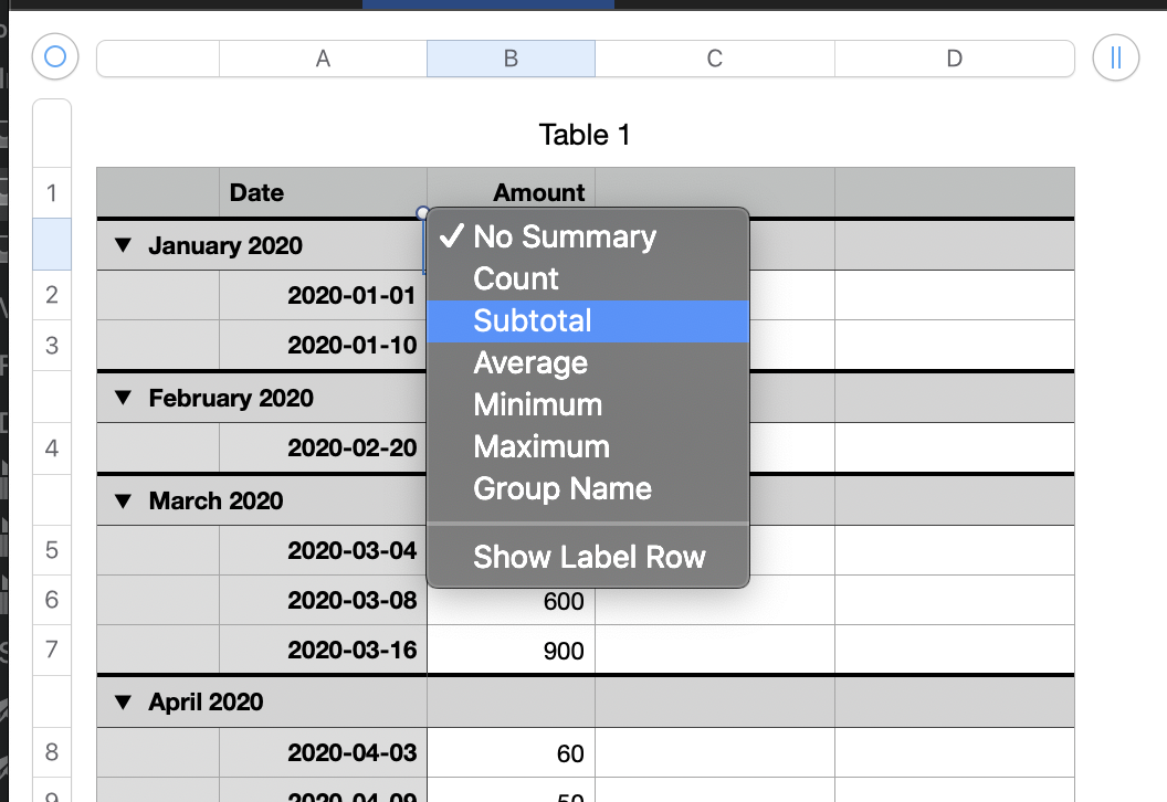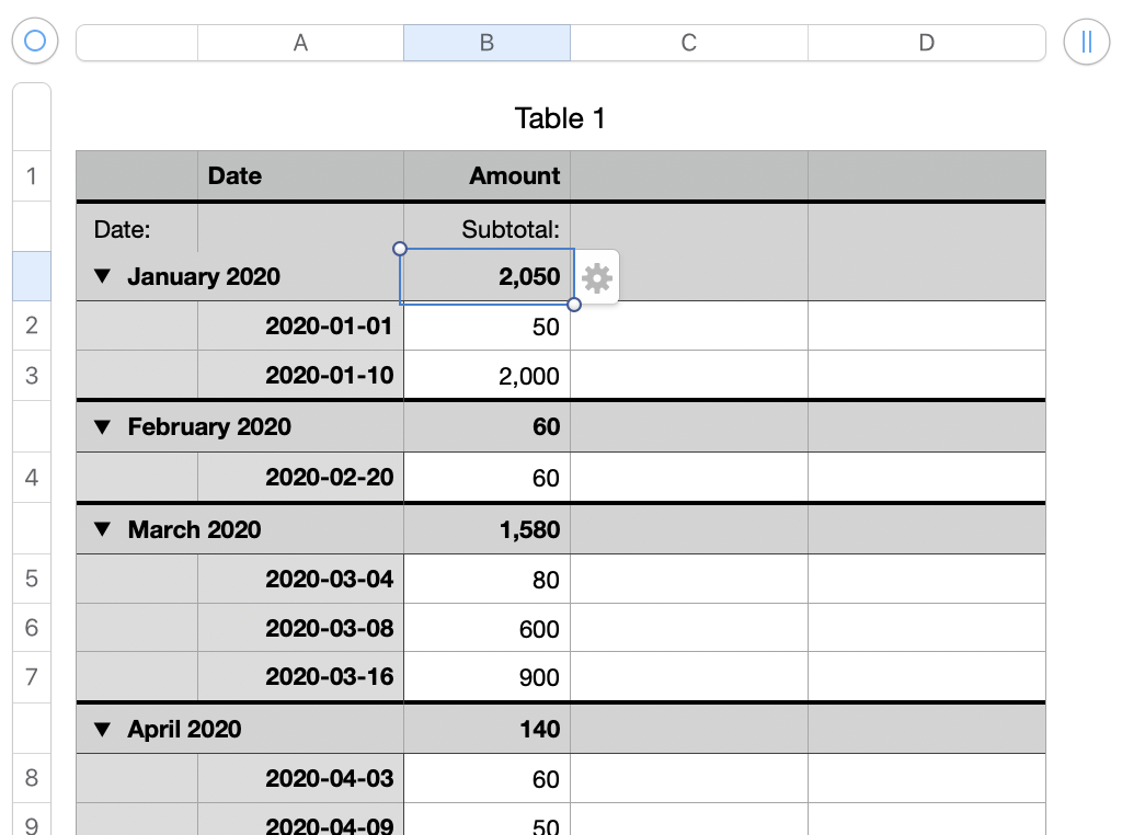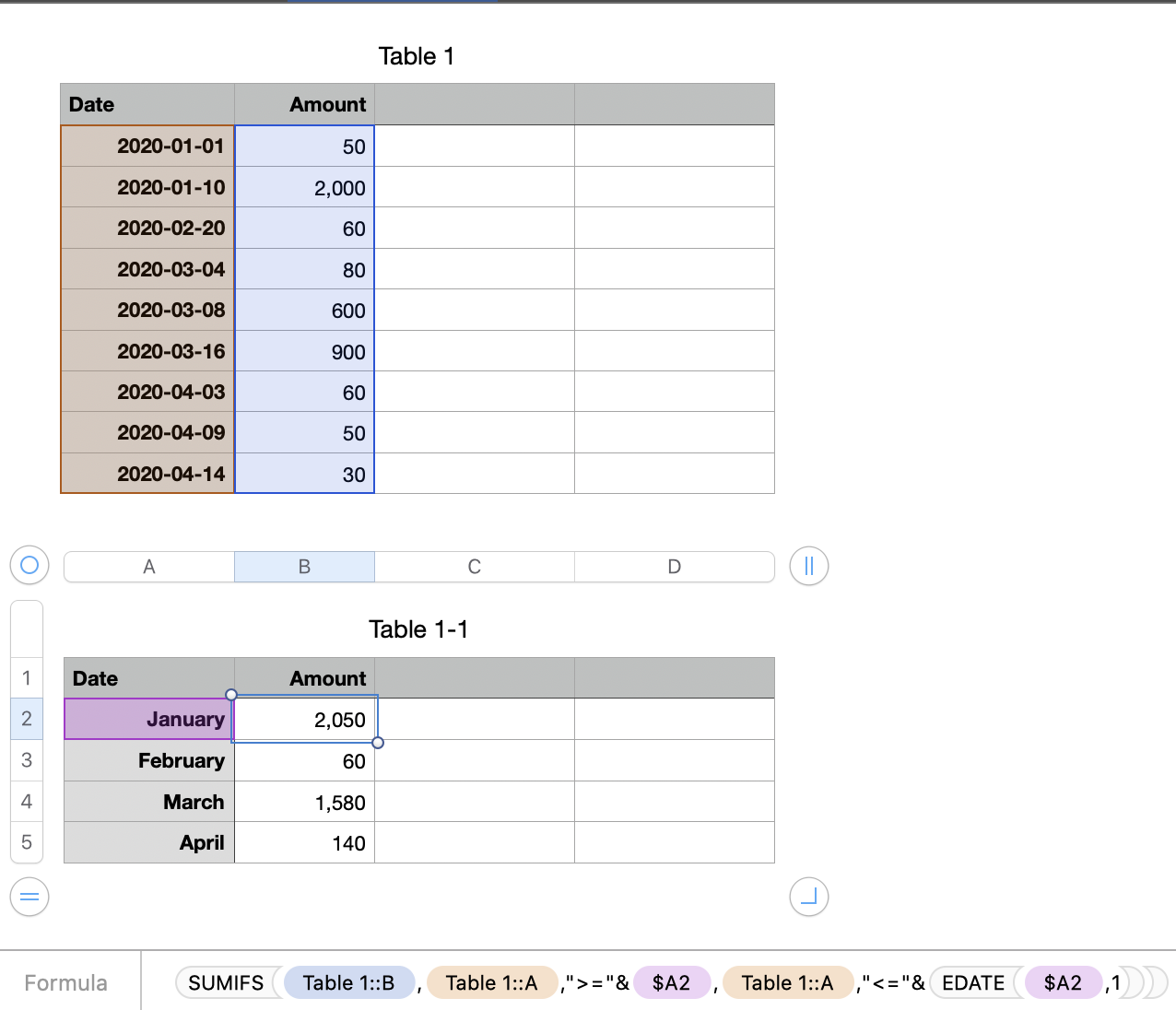 =SUMIFS(Table 1::B,Table 1::A,">="&$A2,Table 1::A,"<="&EDATE($A2,1))